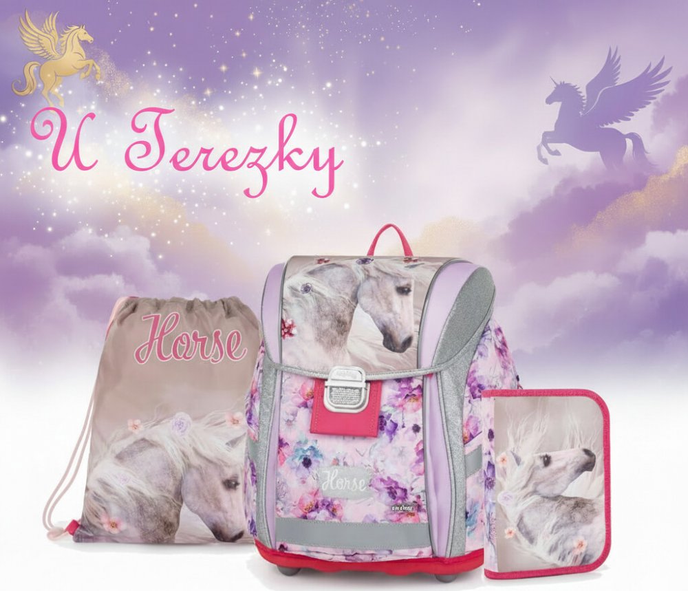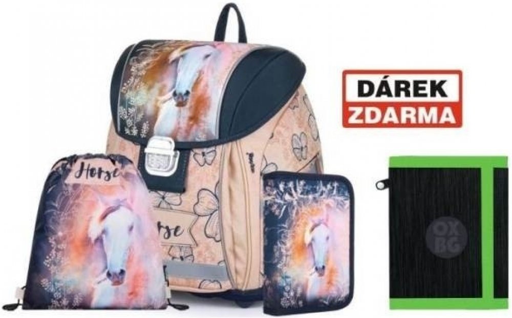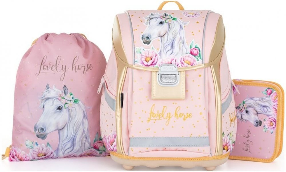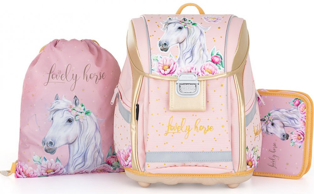 Školní set pro prvňáčka s motivem krásného koně. Set obsahuje školní batoh Premium, sáček na cvičky a nenaplněný jednopatrový penál.