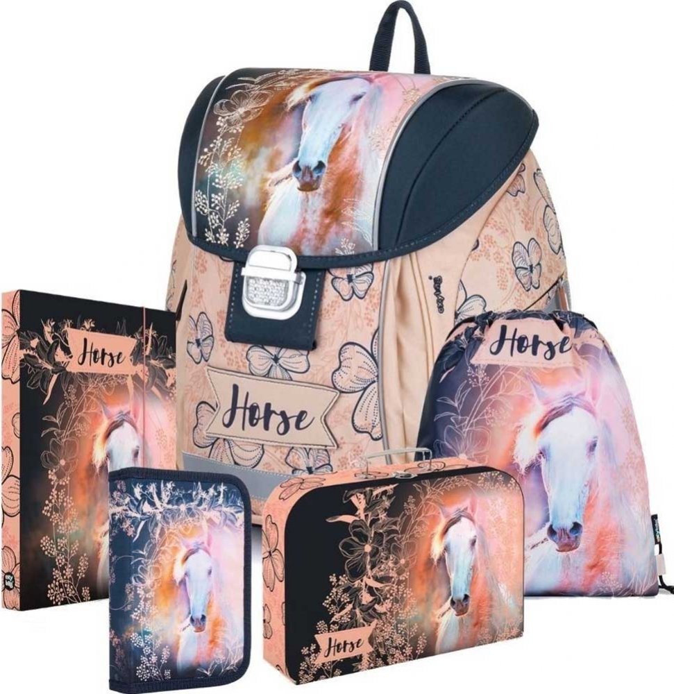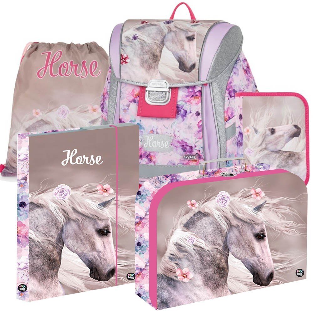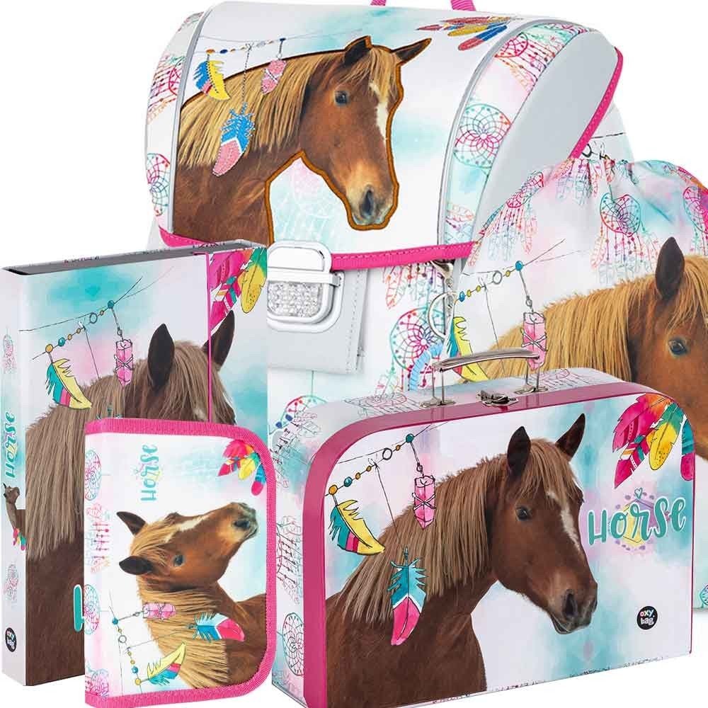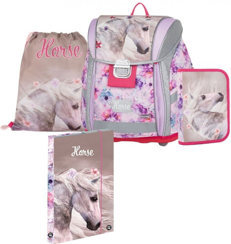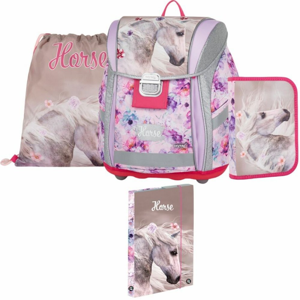5dílný školní set Oxybag PREMIUM LIGHT Kůň romantic obsahuje: aktovku, školní penál, desky A4, kufřík a sáček na přezůvky. Aktovka: Školní taška pro prvňáčka z řady Premium Light nabízí kvalitu, prostor na školní potřeby i odlehčenou konstrukci pro pohodlnější nošení. Díky odlehčenému materiálu váží batoh pouhých 970 g. Polstrování je z příjemného prodyšného materiálu, široké měkčené popruhy jsou navrženy tak, aby dokonale přilnuly a rovnoměrně zatížily ramena dítěte. Pro pohodlnější nošení je batoh vybaven přitažnými a hrudními popruhy. Aktovka je i navíc opatřena přidávnými háčky pro uchycení popruhů. Aktovku ocení především ti nejmladší školáci s výškou od 121 cm. Nechybí ani praktické reflexní prvky, jednoduché magnetické zapínání, vnitřní rozřaďovač i velké množství kapes. Aktovka Premium Light bude tak perfektním parťákem nejen do školy. Délka zádového panelu: 33 cm. Objem: 26 l. Nosnost: 8 kg. Rozměr: 310x400x190 mm Hmotnost: 0,97kg Sáček: Praktický vak na tělocvik nebo přezůvky do školy. Uzavírá se snadno stažením šňůrek. Penál: Jednopatrový školní penál se dvěma klopněmi bez náplně. Gumová poutka k uchycení psacích potřeb. Na vnitřní chlopni je průhledná fólie na rozvrh hodin.Dětský kufřík: Dívčí kufřík na výtvarku je ideální pro uskladnění školních pomůcek nebo výtvarných potřeb. Vejde se do něj formát A4 a díky madlu se snadno přenáší. Box na sešity: box Oxybag ve formátu A4. Nezbytná součást vybavení každého školáka na uložení sešitů, papírů a dalších školních pomůcek. Odolný materiál - lamino, chrání proti poškození. Zavírání na gumičku.