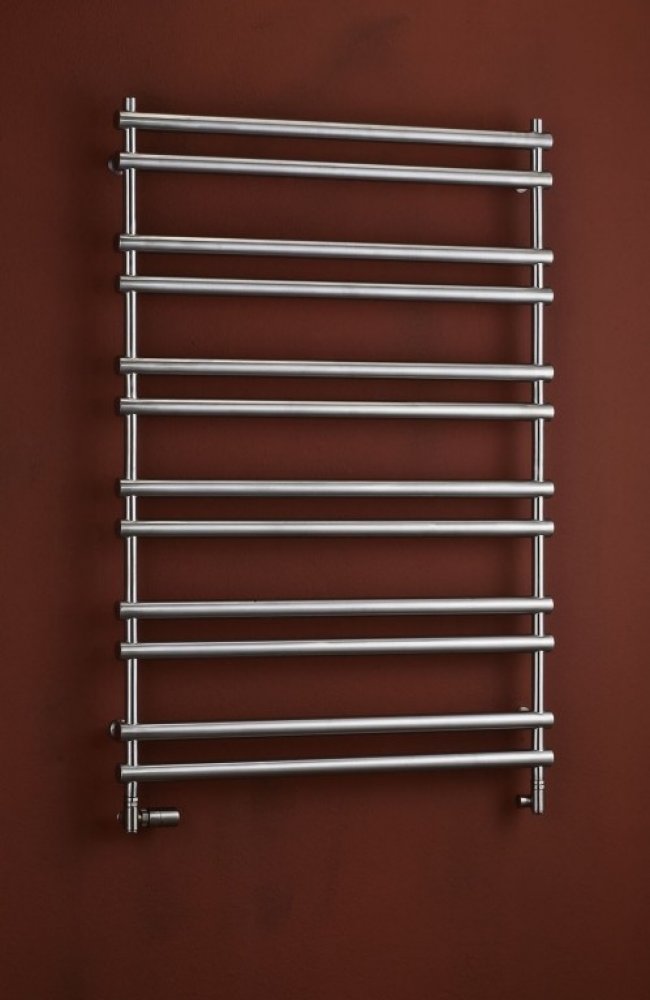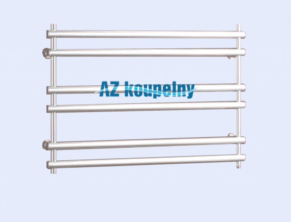 Koupelnový žebřík má důmyslně rozložené příčné trubky, které zcela netradičně přechází skrz svislé boční profily.