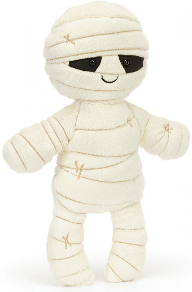 I kostlivci si potrpí na halloweenské kostýmy! Seznamte se s Mumií Bobem – nemrtvým plyšákem v krémových plyšových obvazech s jemnými vyšívanými stehy. Když se podíváte pozorně, uvidíte Bobovy šibalské oči vykukující z klubka obvazů!