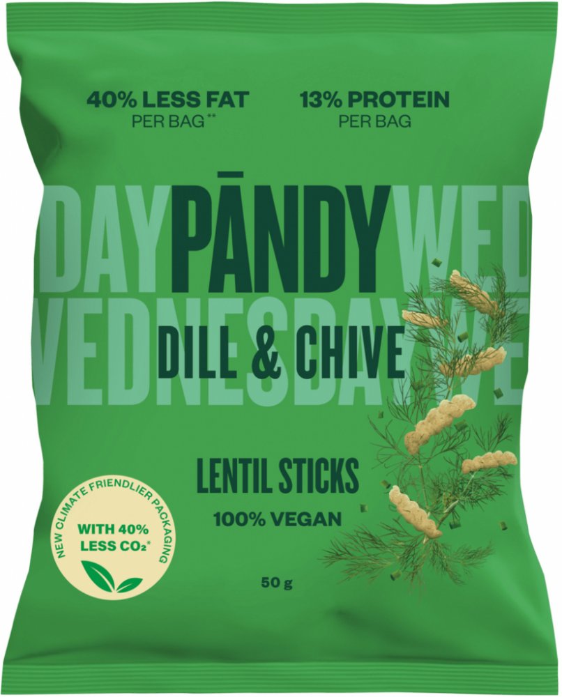 Pändy Čočkové chipsy kopr a pažitka 50 g. 100% vegan 40 % méně tuku na jedno balení 13% bílkovin na porci obaly šetrnější k životnímu prostředí Složení : Mouka z červené čočky 42 %, kukuřičná mouka, řepkový olej, rýžová mouka, směs koření (rýžová mouka, dextróza, sůl, cukr, cibule, přírodní aroma, bylinky (kopr, pažitka) 0,3 %, citronová šťáva, bylinkový extrakt), sůl.