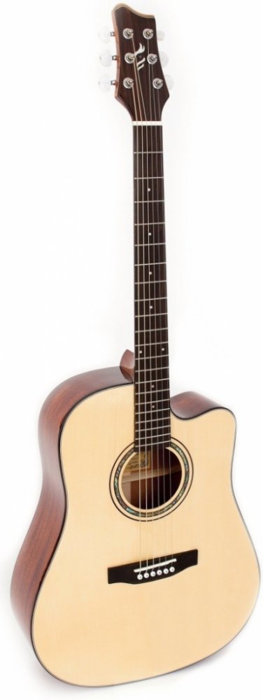 Westernová kytara se zajímavě řešenou hlavou. Bílé perleťové kolíčky ladicí mechaniky.
