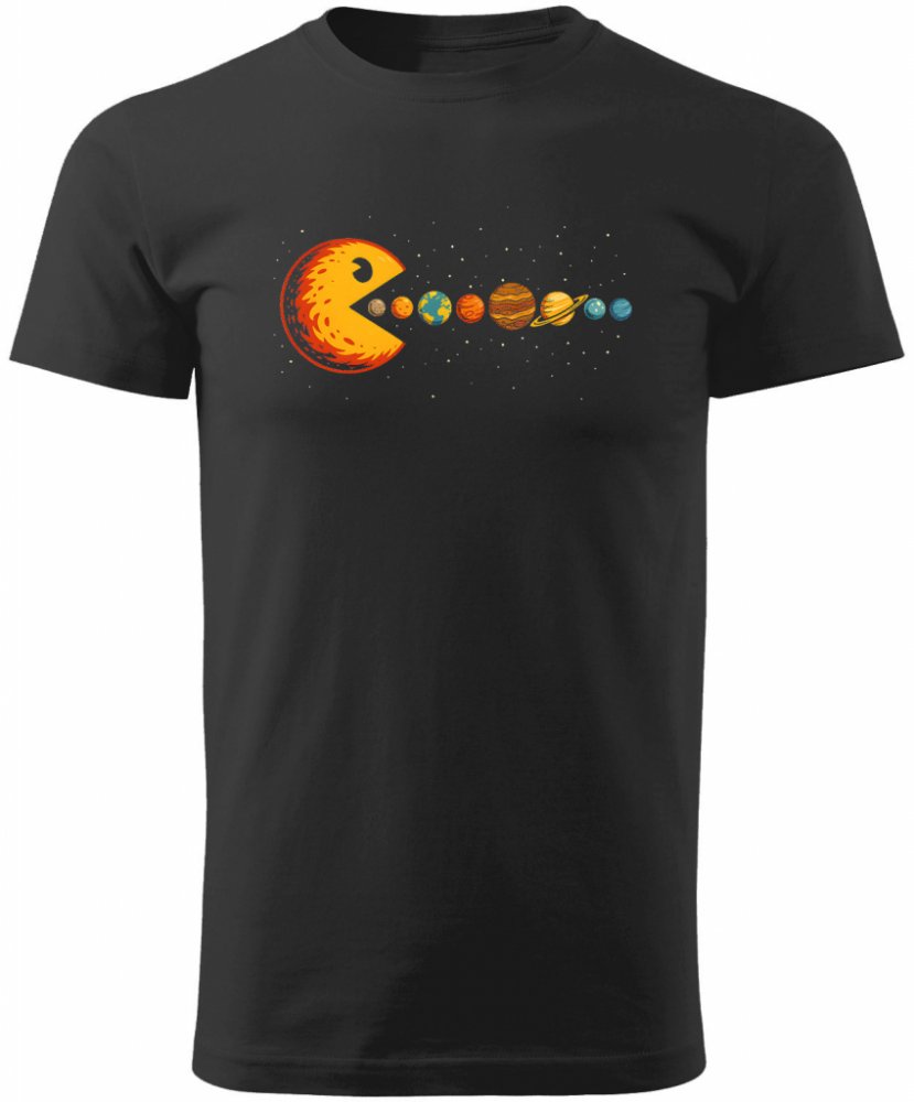 Vtipné bavlněné tričko s parodovaným motivem Pacmana, který požírá celou sluneční soustavu.