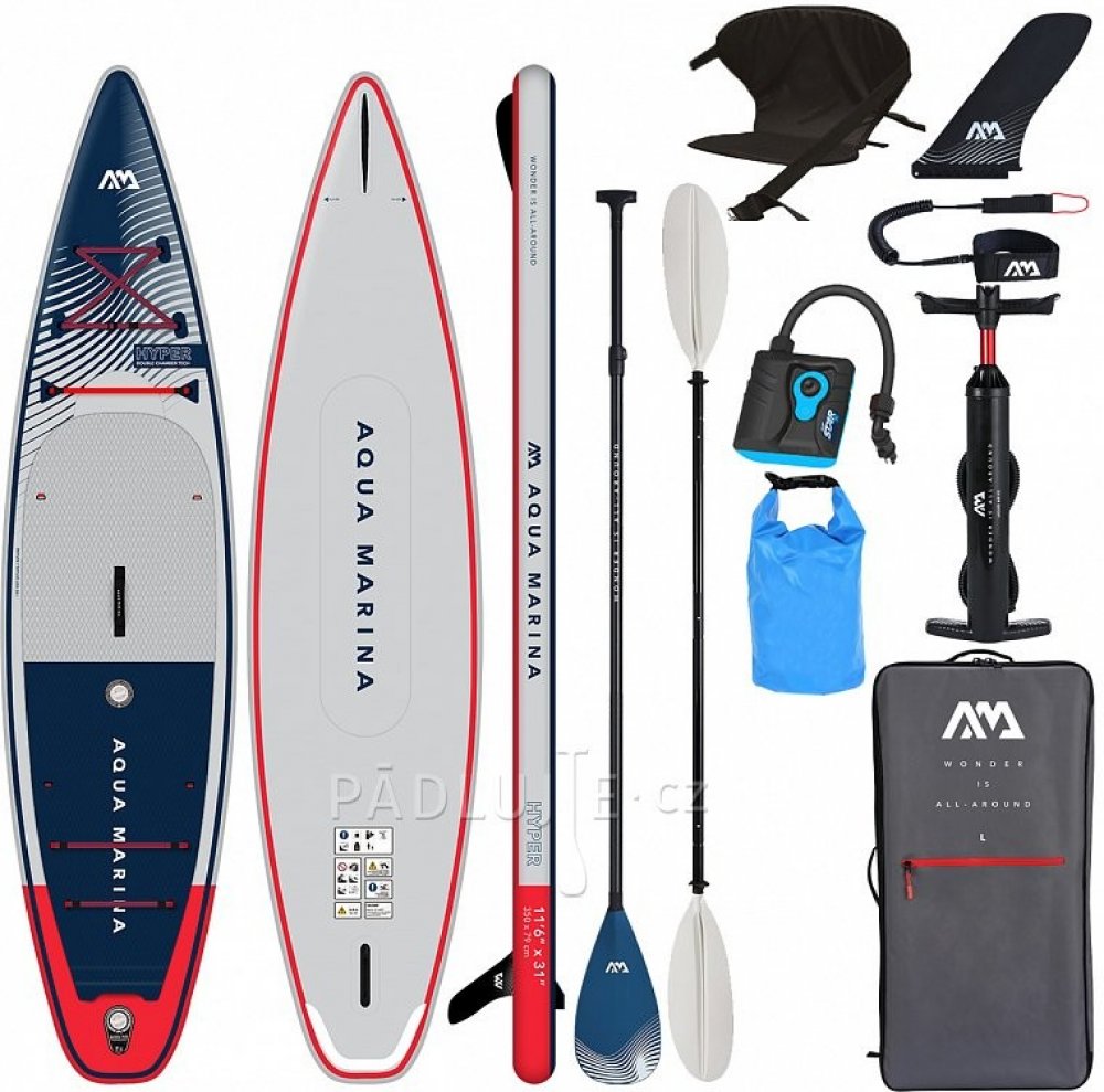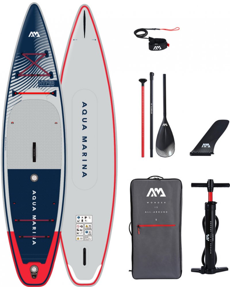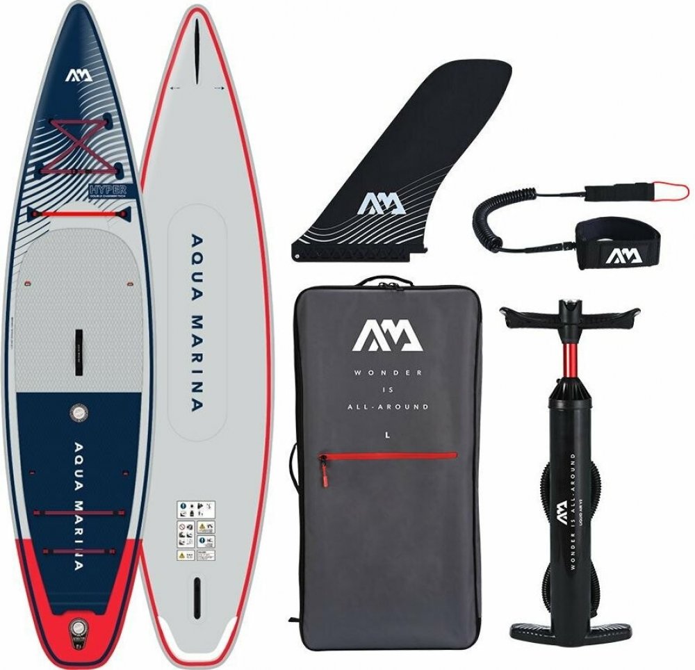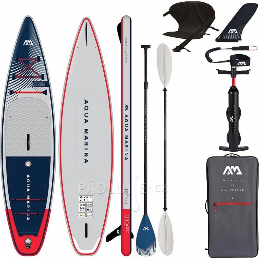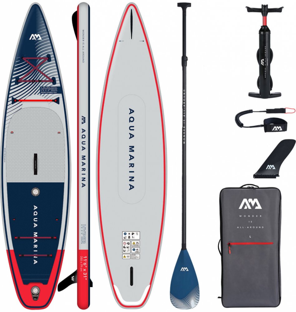 Aqua Marina nabízí širokou škálu svých SUPů od všestraných allroundových tvarů přes desky specializované na splav divoké řeky až po raceové speciály s použitím konstrukce, která tě udrží v bezpečí. Touringový model Hyper je ideální na celodenní výlety po řece, jezeře ale skvěle poslouží i na hladině moře. Model 2023 přichází s více novinkami jako FORE KEEL, který perfekně udržuje směr jízdy a REC EDGE kolejnici pro efektivnější odvádění vody a tím rychlejší jízdu. Nový Red Strap Bungee systém přichytí více nákladu a peskově vlněný povrch Diamond EVA gripu je úžasně podhodlný s parádním přilnutím.