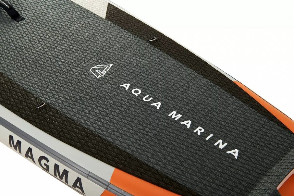 Perfektní allroundový tvar, nízká váha a tuhost konstrukce to jsou hlavní přednosti nového paddleboardu Aqua Marina Magma. Tento univerzální nafukovací SUP vyniká také možností připojení kajakové sedačky, což ještě více podtrhuje jeho všestranné využití. Hezký vynovený design, který zaujme na první pohled je už jen třešničkou na dortu. O pohodlí na prkně během jízdy, sezení, ale i zábavě se postará měkká broušená EVA pěna s povrchem crocodile skin. V její zádi se nachází vyvýšený kick pad, pro ještě efektivnější manévrování. Paddleboard Aqua Marina Magma je dále vybaven bungee lanem, pod které si můžeš připevnit brýle, ploutve, či jiné vybavení na expedici, neoprenovou rukojetí ve středu desky pro snadnou manipulaci a přenos k vodě a kovovým očkem v zadní části k připevnění pojistného popruhu.