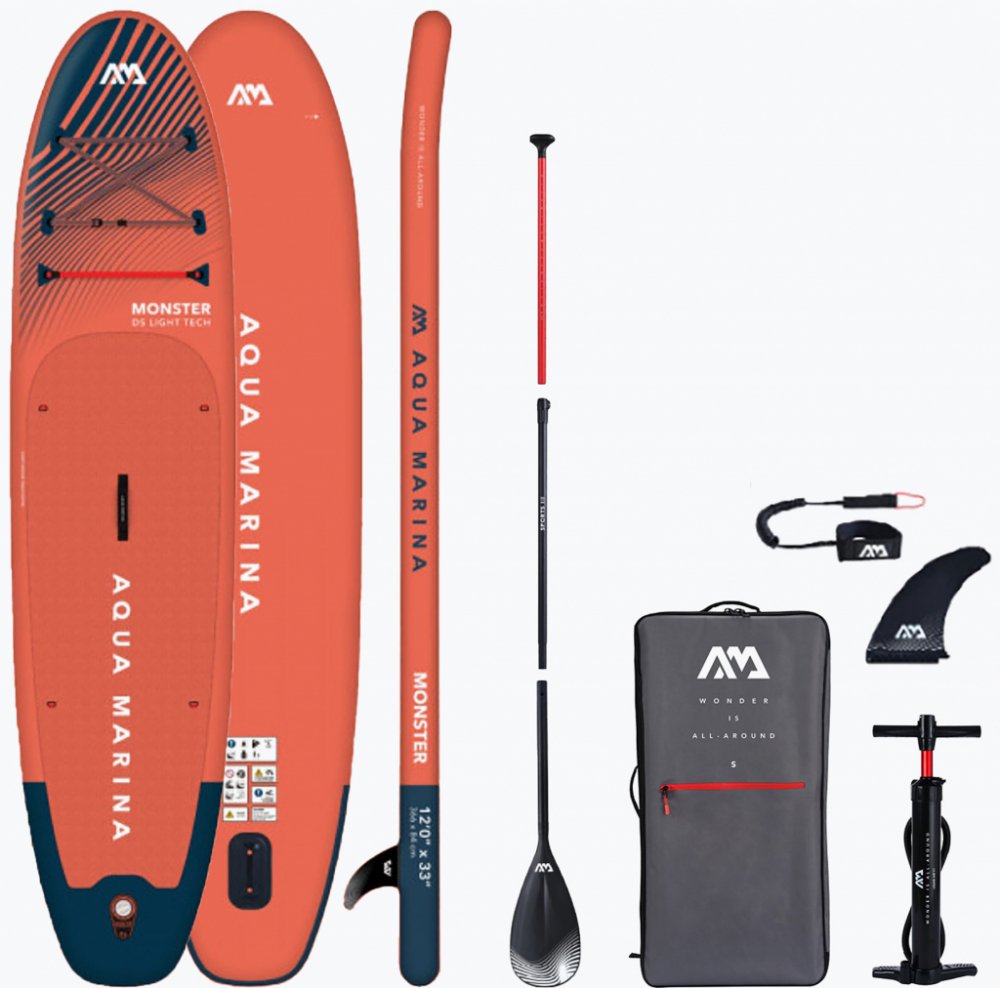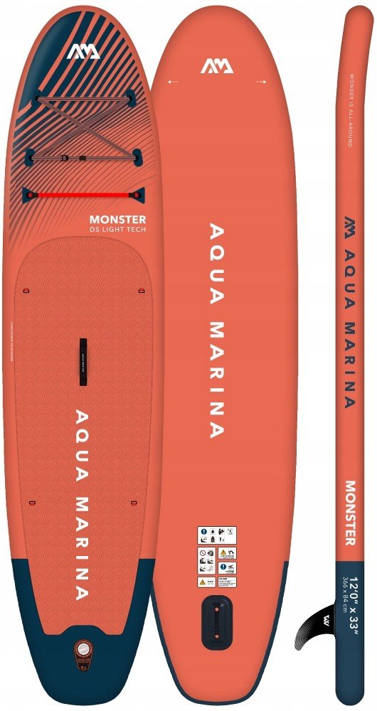 Plošina SUP AQUA MARINA MONSTER 12'0 model 2025 patří do kategorie velkých rodinných paddleboardů. Jedná se o kategorii pro mimořádně velké veslaře nebo pokud plánujete veslovat na prkně ve dvou dospělých osobách. Deska o velikosti 12'0 je velmi všestranná, univerzální a skvěle poslouží jako model. Doporučuje se pro klidnější vody a jezera. Technologie Drop Stitch Light, která byla použita u tohoto modelu, činí paddleboard lehčím – oceníte ho zejména při jeho manipulaci na souši. MONSTER dokáže unést opravdu hodně. Podle našeho testu by však největší jediný veslovací trenažér neměl vážit více než 120 kg. Výrobce naopak uvádí, že maximální zatížení prkna je 170 kg, ale týká se situace, kdy je hmotnost dokonale a rovnoměrně rozložena po celé ploše (což je prakticky nedosažitelné). Pokud jste těžší, doporučujeme SUPER TRIP 14 nebo pokročilejší model ATLAS. Ten má dodatečné vyztužení a lepší pádlo (ze skleněných a uhlíkových vláken) v základní sadě.