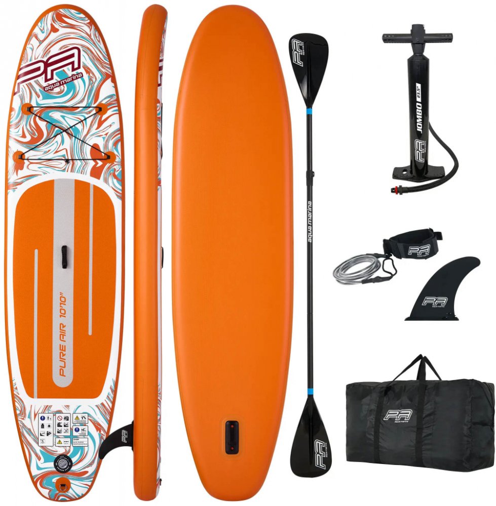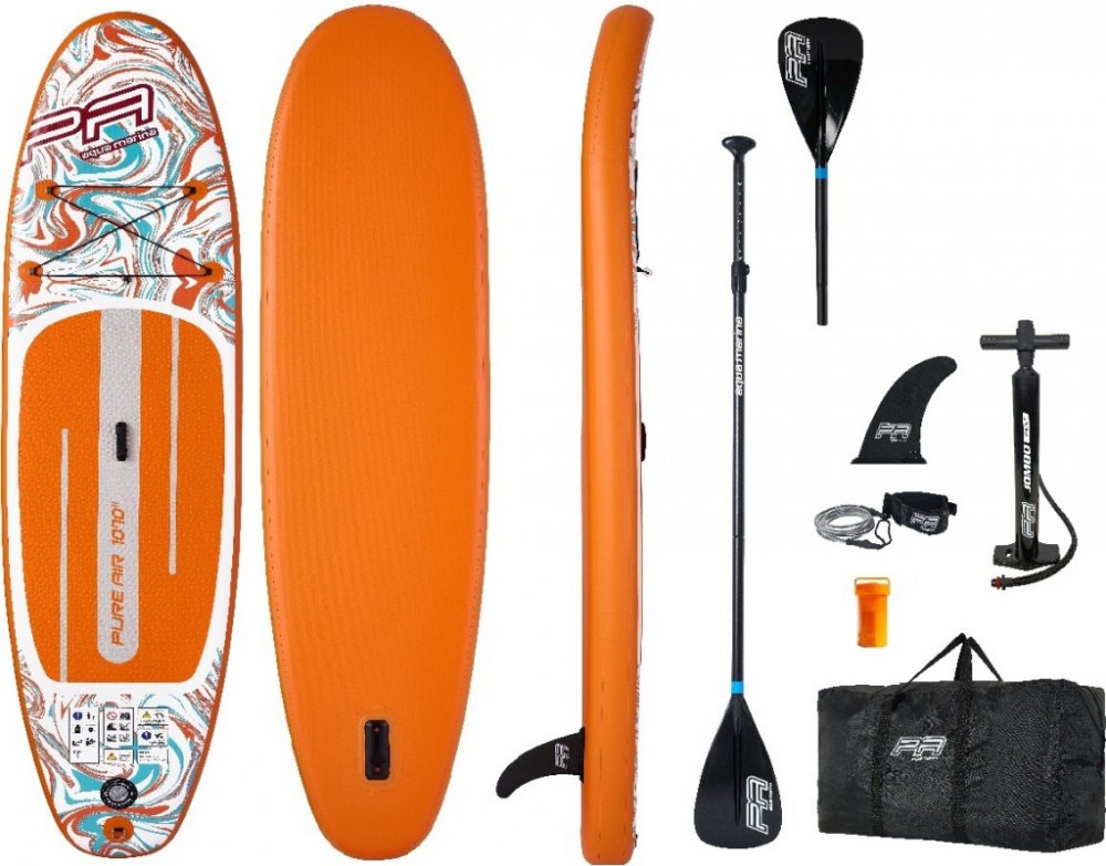 Aqua Marina Pure Air Coast 10'10 SUP prkno - lehké, robustní, všestrannéNafukovací SUP prkno Aqua Marina Pure Air Coast 10'10" je ideální volbou pro začátečníky i pokročilé. S délkou 330 cm a šířkou 81 cm nabízí toto prkno vynikající stabilitu a vynikající klouzavé vlastnosti - na jezerech, řekách i klidném moři.Díky technologii drop-stitch je prkno extrémně lehké (pouze 8,3 kg) a zároveň robustní. Díky maximální nosnosti 150 kg je ideální pro dospělé a dospělé s dětmi.Mini kombo set obsahuje vše, co potřebujete, abyste mohli ihned začít jezdit: kvalitní hliníkové pádlo 2v1, výkonnou ruční pumpu, bezpečnostní vodítko a praktickou přepravní tašku. Hlavní vlastnosti: Rozměry: 330 cm délka x 81 cm šířka x 15 cm tloušťka Robustní konstrukce s kapkovitým stehem - odolná a rozměrově stabilníHmotnost pouze 8,3 kg - snadné přenášení a skladování Protiskluzová podlaha EVA se vzorem včelí plástve - bezpečná opora pro nohy Pogumovaný systém zavazadel na přední straně Montáž zasouvací ploutve bez použití nářadí D-kroužek pro bezpečnostní lano nebo sedačku do kajaku (volitelně) Rozsah dodávky:SUP prkno Aqua Marina Pure Air Coast 10'10" (330 cm)hliníkové pádlo 2v1 (funkce SUP/kajak)Ruční pumpa Pure-AirBezpečnostní vodítko (leash)Zasouvací ploutevPřepravní taška Technické údaje:Délka: 330 cmŠířka: 81 cmTloušťka: 15 cmMaximální tlak: 15 PSIMax. Nosnost: 150 kgHmotnost: 8,3 kgBarva: oranžovo-modrá (Coast Edition)Doporučená hmotnost uživatele: do cca 100-120 kg