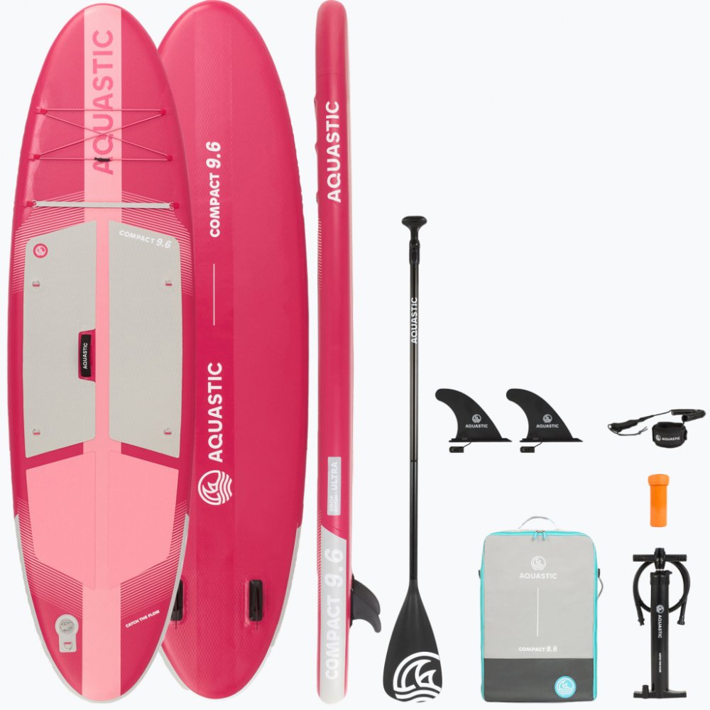 AQUASTIC Compact 9'6" je všestranný model navržený pro uživatele, kteří hledají lehkou, snadno přenosnou a skladovatelnou SUP desku. Kompaktní konstrukce zajišťuje, že se skvěle hodí na prázdninové výlety, a zároveň si zachovává stabilitu a pohodlí typické pro klasické allround modely. Je to ideální volba pro osoby, které začínají svou cestu se stand up paddle, a také pro ty, kteří ocení funkčnost spojenou s úsporou místa. Technologie DROP STITCH ULTRA – nízká hmotnost, vysoká tuhost Model AQUASTIC Compact 9’6” vychází z jednovrstvé PVC vrstvy o hustotě 2200 g/m², která se vyznačuje odolností proti propíchnutí, UV záření a slané vodě. Model byl vyroben v pokročilé technologii DROP STITCH ULTRA. Díky ní bylo možné dosáhnout vysoké tuhosti a odolnosti desky při minimální hmotnosti. Bylo použito svařování vnitřních vrstev a lepení okrajů trupu, což nejen zvyšuje trvanlivost, ale také omezuje spotřebu lepidla, čímž činí výrobu šetrnější k životnímu prostředí. Integrované stringery – dodatečné zpevnění Aby se dále zvýšila tuhost konstrukce, byla deska vybavena dvěma stringery – speciálními výztuhami umístěnými podél horní a dolní plochy. Díky nim deska lépe udržuje tvar i při velkém zatížení, což se promítá do vyššího komfortu a efektivity při plavání. Woven, linear drop stitch – lehká a odolná struktura Technologie linear drop stitch spočívá v podélném uspořádání vláken, která vytvářejí vnitřní strukturu desky. Tato vlákna se navíc kříží, což zlepšuje odolnost proti deformacím a posiluje celou konstrukci. V důsledku toho je deska kompaktnější, lépe snáší intenzivní používání a déle si zachovává původní vlastnosti. Rozměry a nosnost – ideální pro každodenní použití Model má délku 290 cm, šířku 79 cm a tloušťku 12 cm, což zajišťuje výtlak na úrovni 220 litrů. Maximální zatížení 95 kg umožňuje pohodlné používání jednou osobou spolu s lehkým zavazadlem. Nižší profil desky zajišťuje, že těžiště je níže umístěno, což zvyšuje stabilitu a kontrolu – zvláště důležité pro lehčí uživatele. Praktické doplňky – plná funkčnost AQUASTIC Compact 9’6” má 4 D-kroužky umožňující montáž kajakového sedadla, a také elastické cargo šňůry, díky nimž lze bezpečně upevnit zavazadlo na přídi desky. Široká transportní rukojeť uprostřed desky usnadňuje její přenášení, a souprava obsahuje všechny nezbytné prvky: pumpu, leash, pádlo, batoh a opravnou sadu.