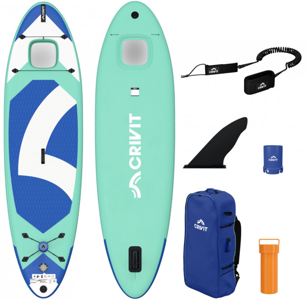Crivit Jednokomorový paddleboard Allround 10'3" Široký tvar pro vysokou stabilitu proti převrácení a širokou škálu použití Průhledové okénko na přídi Široký tvar pro vysokou stabilitu proti převrácení 45° zásuvná ploutev pro snadnou instalaci Protiskluzová krycí podložka z EVA s diamantovým řezem Jednokomorový systém pro nižší hmotnost Elastická síťka na zavazadla včetně karabiny a držáku na nápoje Snadná přeprava díky kompaktní velikosti balení a praktickému batohu Nerezový D-kroužek pro připevnění lanka (cca 300 cm) Vysokotlaké šroubové ventily pro snadné napumpování a vypouštění vzduchu Poutko na přenášení uprostřed desky pro snadnou a pohodlnou přepravu Příslušenství: batoh, lanko, sada na opravy, zásuvná ploutev, držák na nápoje Maximální nosnost: 140 kg Maximální tlak vzduchu: 15 psi (1 bar) Vhodný pro 1 osobu Rozměry Deska (po napumpování): cca 315 x 84 x 15 cm (D x Š x V) Batoh: cca 46 x 95 x 25 cm (Š x V x H) Hmotnost cca 8 kg