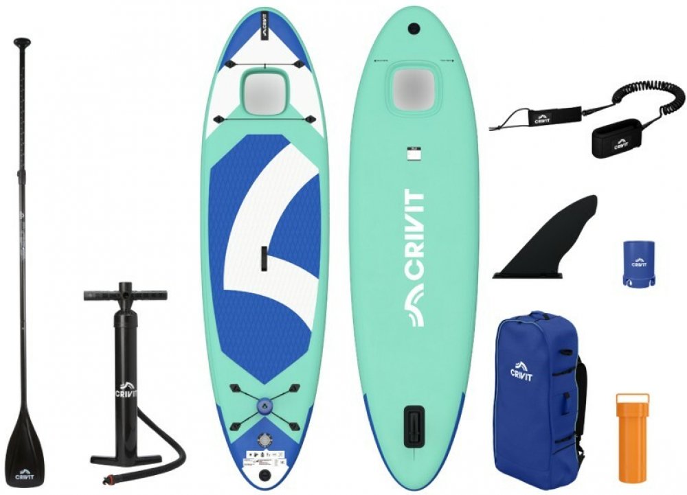 Crivit Jednokomorový paddleboard Allround 10'3" Široký tvar pro vysokou stabilitu proti převrácení a širokou škálu použití Průhledové okénko na přídi Široký tvar pro vysokou stabilitu proti převrácení 45° zásuvná ploutev pro snadnou instalaci Protiskluzová krycí podložka z EVA s diamantovým řezem Jednokomorový systém pro nižší hmotnost Elastická síťka na zavazadla včetně karabiny a držáku na nápoj...