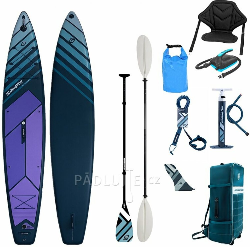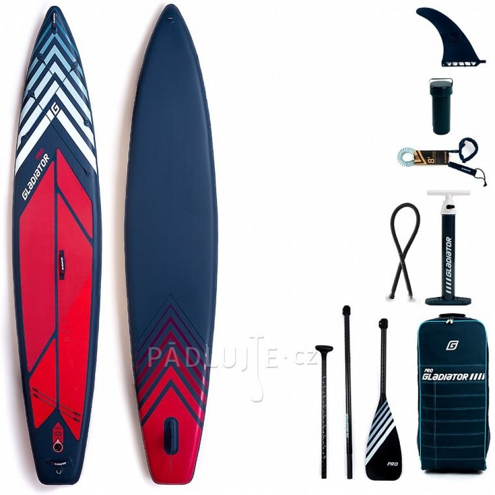 Řada paddleboardů GLADIATOR PRO je dodávána s bohatou výbavou, lehkým karbonovým pádlem, výkonnou pumpou, krouceným leashem a pěkným batohem s kolečky.
