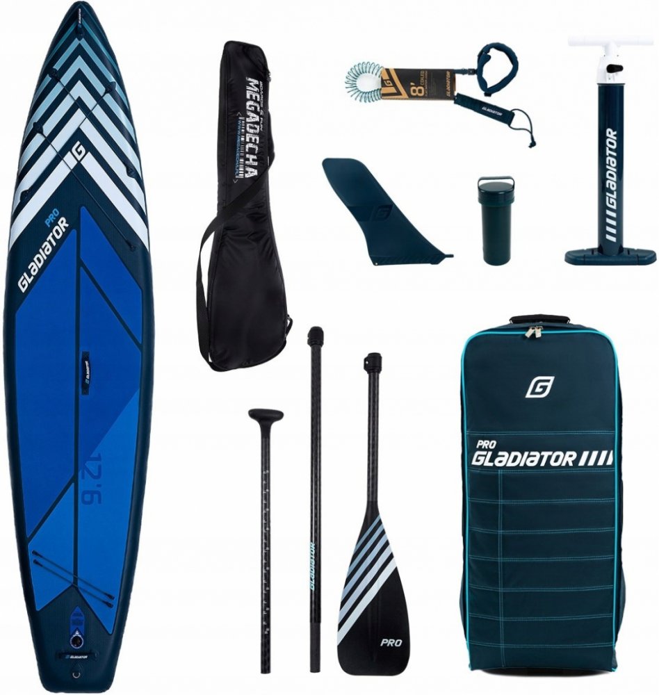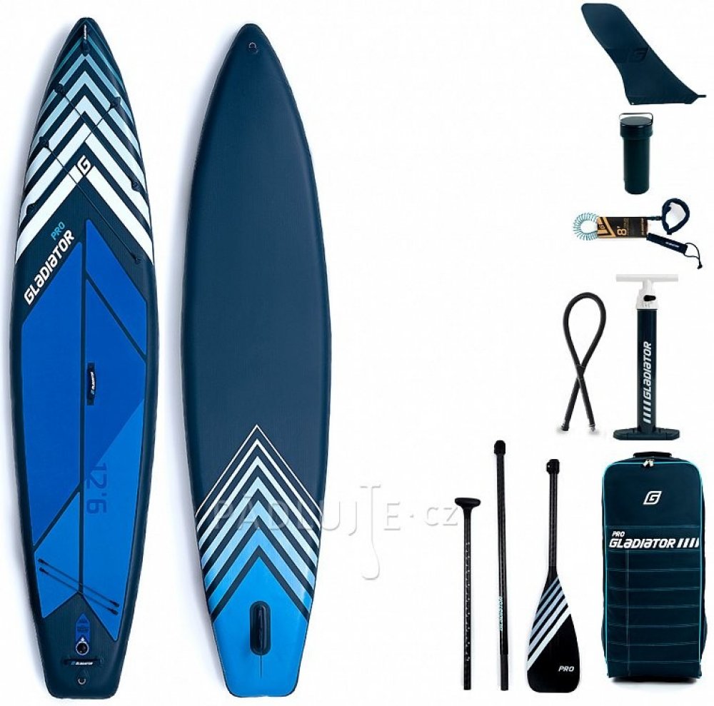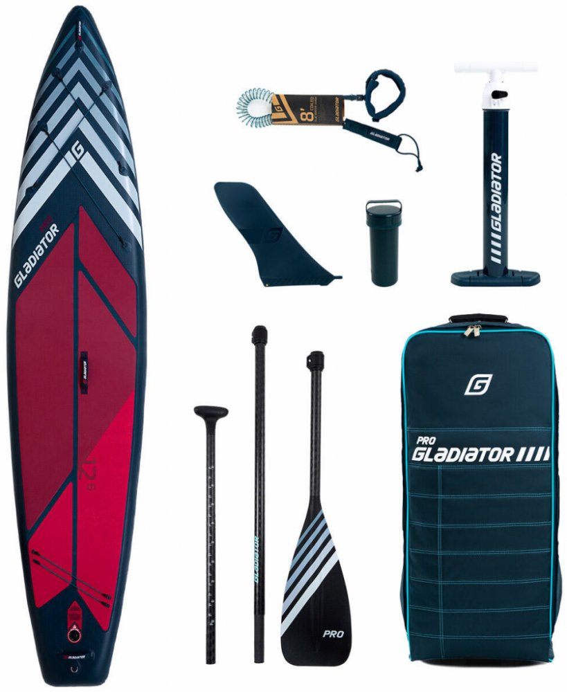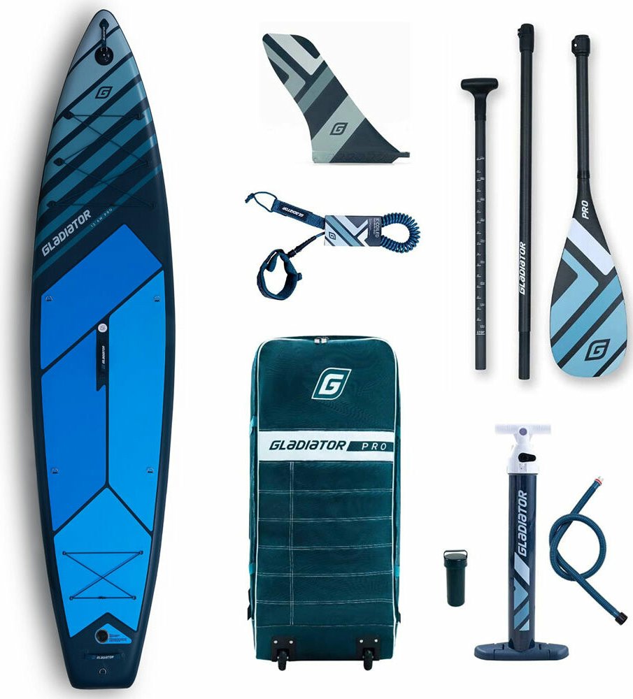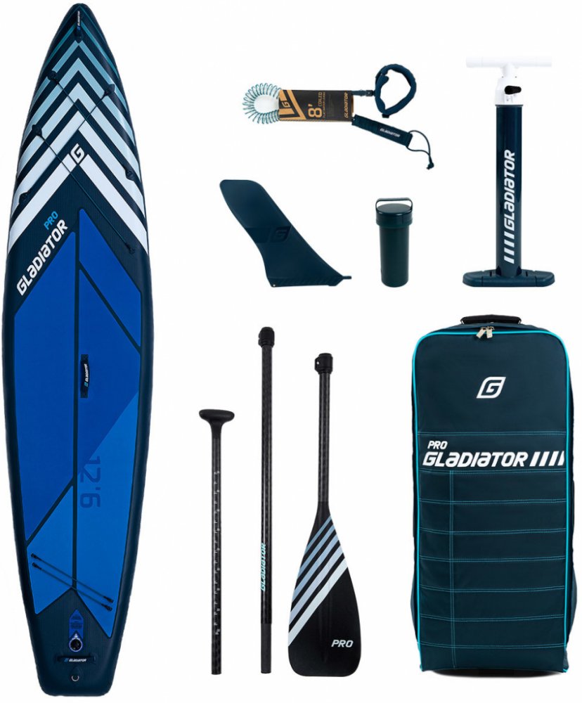 Řada paddleboardů GLADIATOR PRO je dodávána s bohatou výbavou, lehkým karbonovým pádlem, výkonnou pumpou, krouceným leashem a pěkným batohem s kolečky.