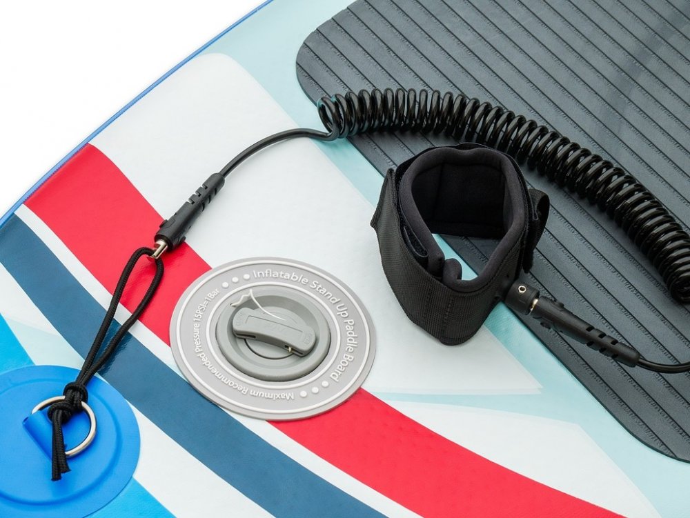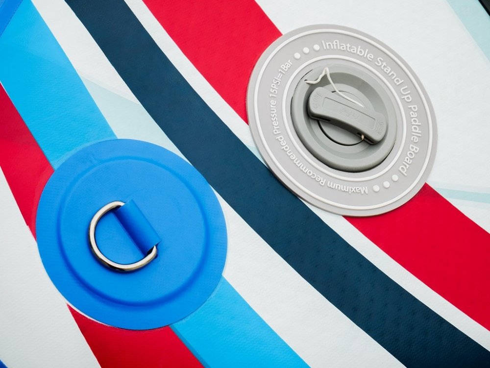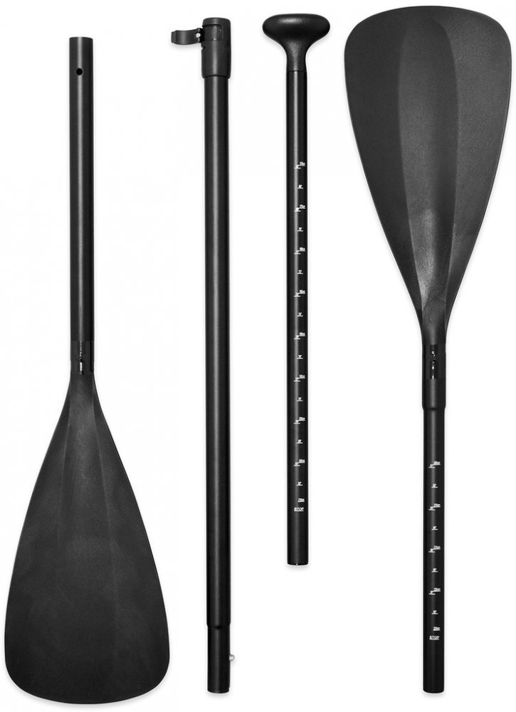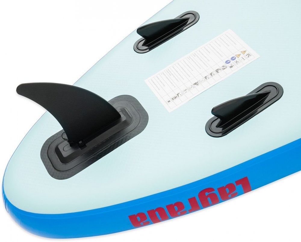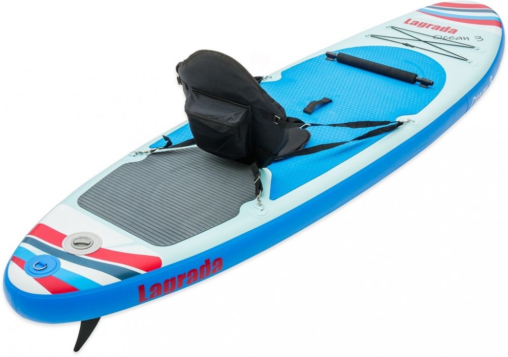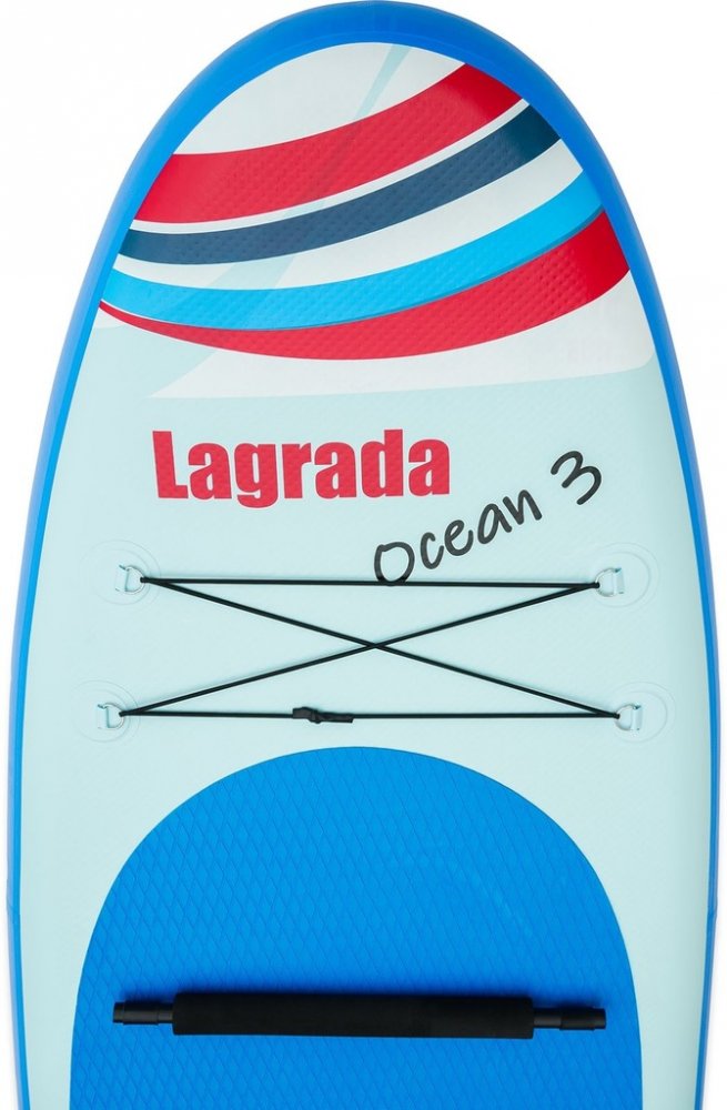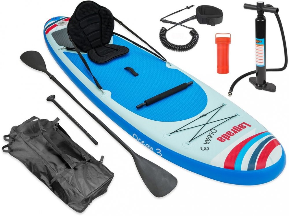 Nafukovací paddleboard Lagrada Ocean 3, tvar "ALL ROUND" vhodný pro začínající i pokročilé uživatele, technologie "DROP STITCH" pro větší stabilitu, nosnost 130 kg, délka 300 cm, šířka 85 cm, výška 15 cm, široká nášlapná protiskluzová EVA plocha pro vysokou stabilitu a bezpečné stání, nové zpevněné dvojité uchycení sedadla, díky nastavitelnému sedadlu a opoře nohou můžete pádlovat i v sedě, sedlo je v zadní části vybaveno velkou voděodolnou kapsou, opatřen madlem pro snadné přenášení, pádlo s hliníkovým dříkem, nastavitelná délka s možností vytvoření dvojpádla, kroužkem pro upevění pružného bezpečnostního "LEASHE" na nohu (délka leashe 3,2 m), velkou odnímatelnou ploutví pro jednoduché ovládání, pružným popruhem pro přepravu nákladu, voděodolným batohem pro snadné přenášení (celková hmotnost 11kg) a skladování a vysokotlakou pumpou s manometrem, součástí balení je i sada na opravu, vyroben z vícevrstvého vysoce odolného lepeného PVC zajišťující odolnost a pevnost.