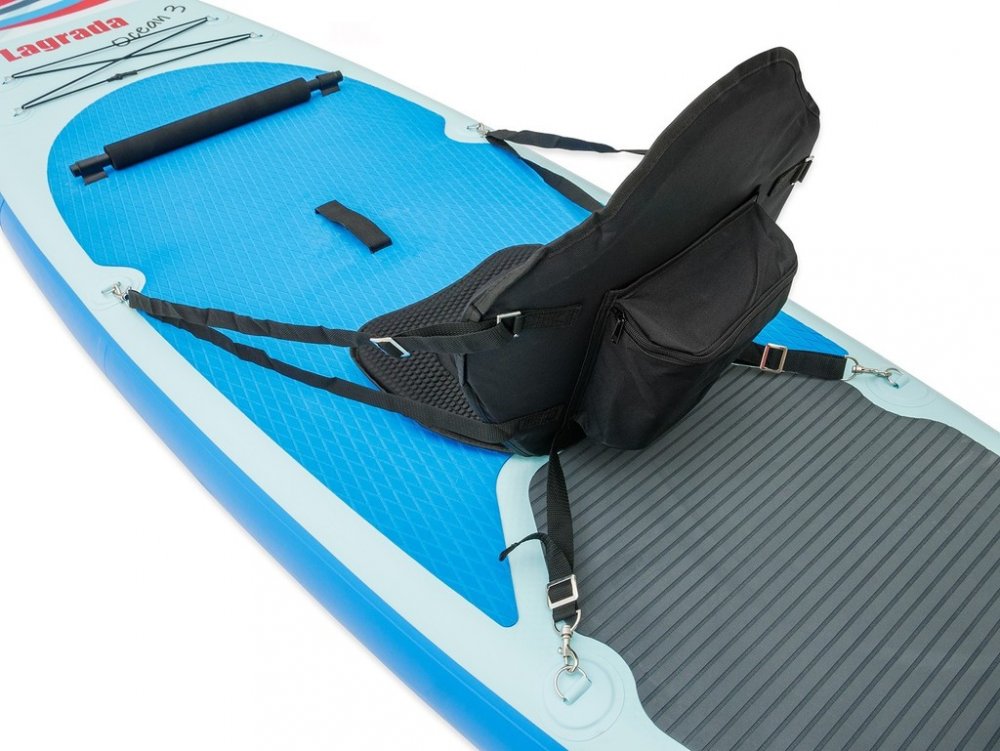 Nafukovací paddleboard Lagrada Ocean 3, tvar "ALL ROUND" vhodný pro začínající i pokročilé uživatele, technologie "DROP STITCH" pro větší stabilitu, nosnost 130 kg, délka 300 cm, šířka 85 cm, výška 15 cm, široká nášlapná protiskluzová EVA plocha pro vysokou stabilitu a bezpečné stání, nové zpevněné dvojité uchycení sedadla, díky nastavitelnému sedadlu a opoře nohou můžete pádlovat i v sedě, sedlo ...