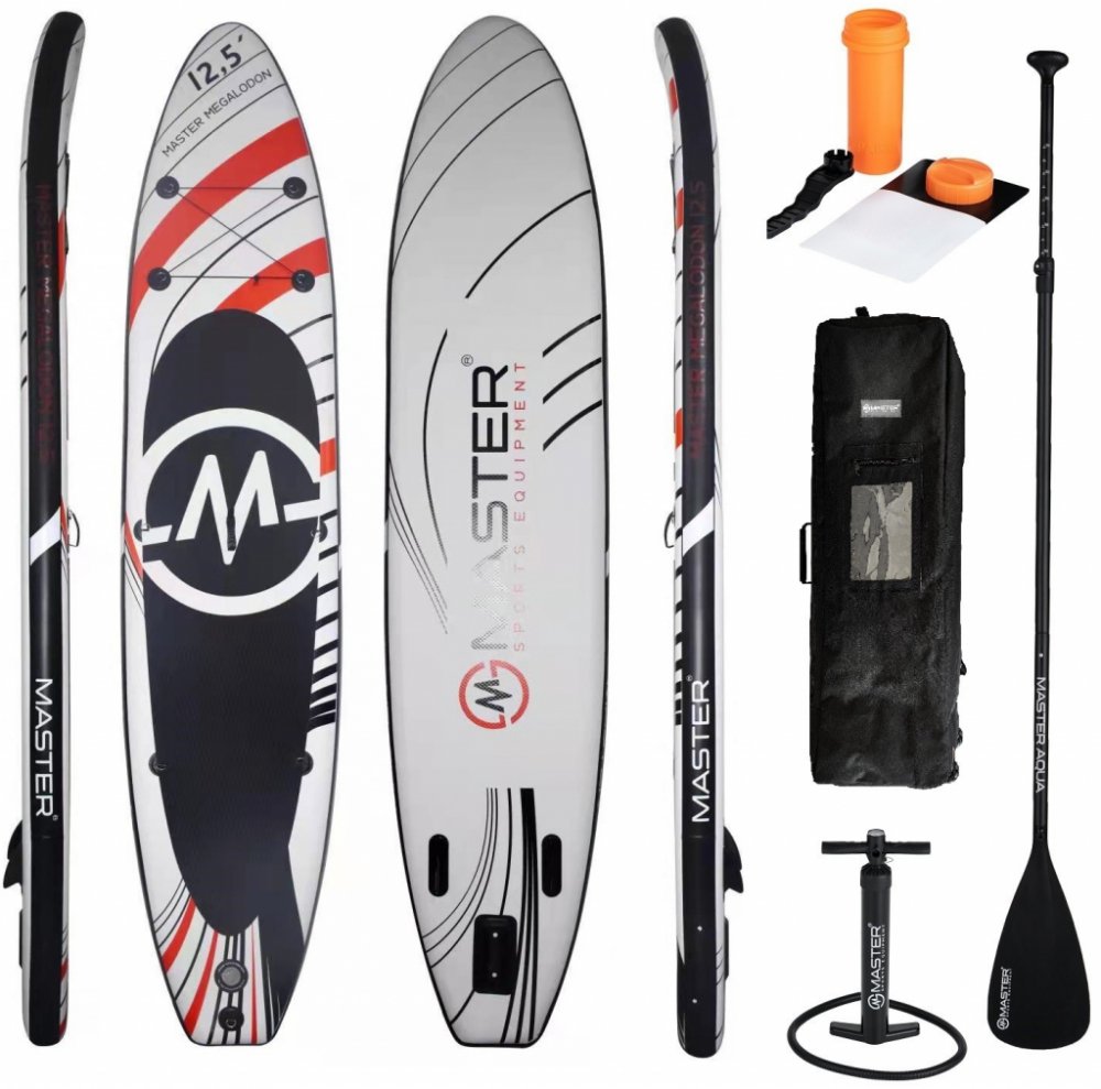 Paddleboard MASTER Aqua Megalodon - 12.5" je určený pro začátečníky i pokročilé jezdce v klidných vodách a na mírných vlnách. Velký rozměr a nosnost 170 kg zajistí dokonalou zábavu jak pro jednotlivce, tak i pro rodiče s dětmi. Tuhost paddleboardu zajišťuje výška 15 cm a použitý dvouplášťový DROP STICH materiál. Je vyroben z odolných materiálů i vůči slané vodě, UV záření, snadno jej nafouknete, vyfouknete a sbalíte do praktické tašky s kolečky. Protiskluzový nášlap z EVA pěny zaručí pevný postoj a stabilitu. Paddleboarding je nový vodní sport, při kterém stojíme na boardu a vpřed se pohybujeme pomocí dlouhého pádla. Oblíbený vodní sport umožňuje zapojit rovnoměrně celé tělo, zlepšíit smysl pro rovnováhu a zvýšit celkovou fyzickou kondici. Při pádlování se aktivně zapojují lýtkové svaly na nohou, zádové a šikmé břišní svaly a všechny svaly na rukou. Technická data:univerzální Allround paddleboardsoučástí balení je pádlo, ploutev, vysokotlaká pumpa s tlakoměrem, přepravní taška s kolečky, sada na opravudvouplášťová konstrukce PVC, tloušťka desky 15 cm, nafukovací komora s technologií DROP STITCH (vnitřní polyesterová vlákna)zesílené boční hrany - dvouvrstvý PVC pro vyšší bezpečnost a ochranu proti oděruprotiskluzová plocha EVA materiálrozměr desky: 380 x 81 x 15 cmmaximální nosnost 170 kgvýtlak 360 lhmotnost boardu bez příslušenství: 10 kgmaximální tlak: 15 psi (1,03 bar)madlo pro snadné přenášeníelastické lanka pro upevnění zavazadelodnímatelná ploutev +2 malé pevné přídavné ploutve pro větší stabilitunerezový kroužek pro uchycení bezpečnostního lanka – leashenerezové kroužky pro uchycení sedátka (sedátko není součástí balení)