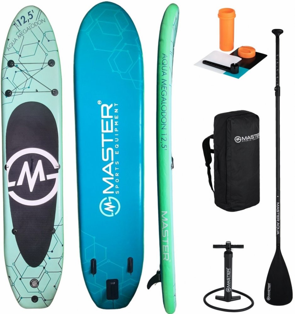 Paddleboard MASTER Aqua Megalodon - 12.5" je určený pro začátečníky i pokročilé jezdce v klidných vodách a na mírných vlnách. Velký rozměr a nosnost 170 kg zajistí dokonalou zábavu jak pro jednotlivce, tak i pro rodiče s dětmi. Tuhost paddleboardu zajišťuje výška 15 cm a použitý dvouplášťový DROP STICH materiál. Je vyroben z odolných materiálů i vůči slané vodě, UV záření, snadno jej nafouknete, v...