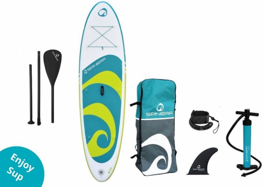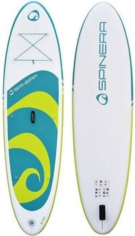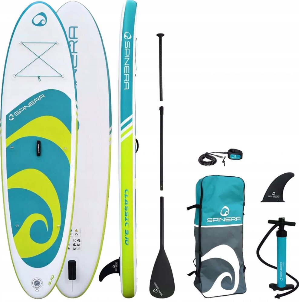 Paddleboardy Spinera jsou kvalitní nafukovací SUP, které se perfektně hodí na klidnou i tekoucí vodu. Nafukovací paddleboard Spinera CLASSIC má 300 x 76 x 15 cm. Maximální nosnost je 115 kg. Optimální tlak: 15 psi. Objem nafukovacího prkna na vodu je 278 litrů. Paddleboard Spinera CLASSIC je pro vás připraven ve žluto-zeleném motivu. Čeká vás kompletní výbava na cesty. Hmotnost samotného paddleboardu je 7,8 kg. Spinera SUP je vyroben z Drop Stitch materiálu s vysokou hustotou. Nášlapná deska je z lisované EVA pěny, která je broušená. Díky tomu je nášlapná deska protiskluzová a komfortní. Nafukovací SUP na vodu disponuje i D-kroužky, do kterých snadno zacvaknete kajakové sedátko, které však není součástí balení. Samozřejmostí je také 4- bodové bungee lano na špici paddleboardu pro uchycení drobností či dry bagu na SUP. Součástí balení je: paddleboard, přenosný batoh, třídílné skládací pádlo Sup ALU, dvojčinná pumpa Classic a středová ploutev.
