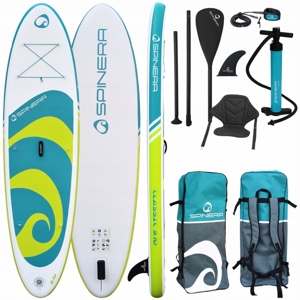 paddleboard SPINERA Classic 9'10''x30''x6'' combo verze Velmi lehký nafukovací paddleboard od německé značky SPINERA je ideálním plovákem pro jezdce do 75kg. Jedná se o stabilní paddleboard menších rozměrů, který je vhodný zejména pro ženy a lehčí jezdce, který je v základním setu vybaven Combo pádlem (kajak i paddleboard) a kajakovou sedačkou. Paddleboard je vyroben silnou jednovrstvou drop-stitc...