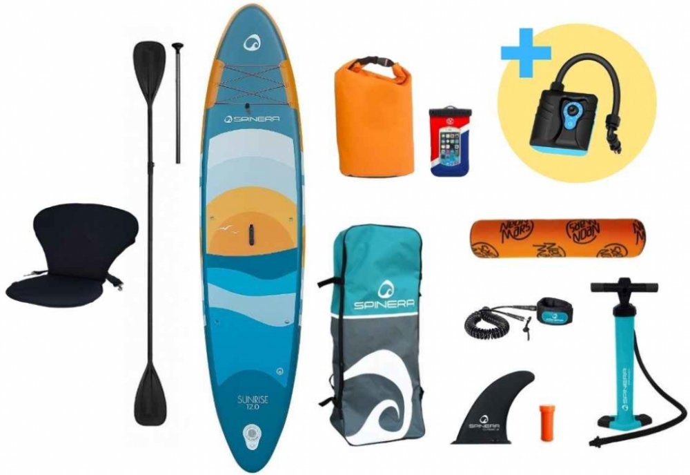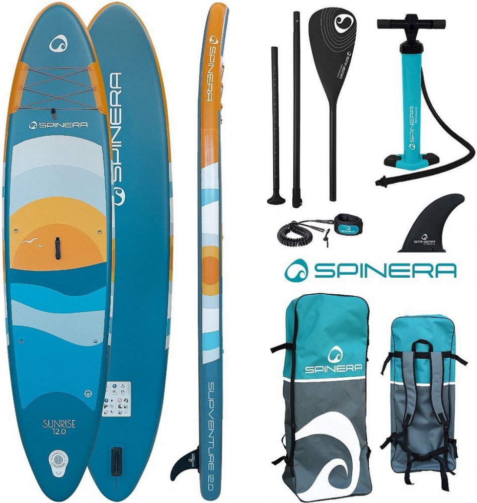 Allround paddleboard Spinera SUPVENTURE SUNRISE 12´ s dvouvrstvou drop stich technologií vyniká mimořádnou tuhostí a z ní vyplývajícími skvělými jízdními vlastnostmi. Plovák je vhodný pro sportovněji zaměřené jezdce, pro které paddleboarding neznamená jen rekreaci na pláži. Nášlapná plocha z EVA pěny s lisovaným diamantovým dezénem zaručuje skvělou přilnavost a zabraňuje proklouznutí. Na přední části je umístěno čtyřbodové lanko pro fixaci lehkého nákladu. D-kroužky umožňuji připevnit kajakovou sedačku, která ovšem není součástí balení.