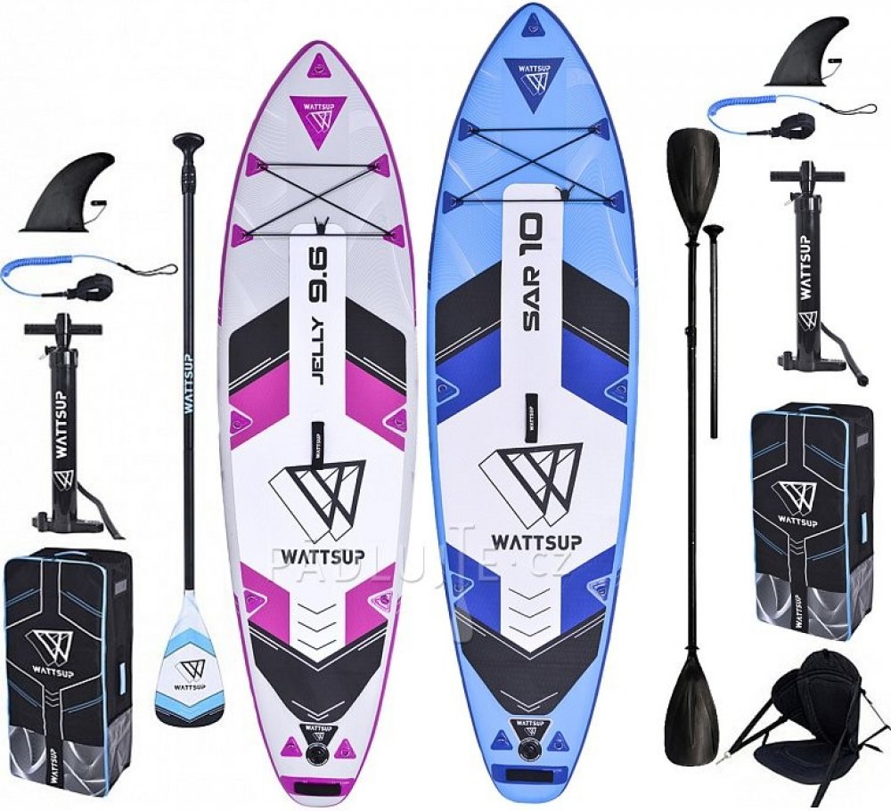 1. paddleboard WattSup Jelly 9,6-30 Dámský, dětský a juniorský paddleboard WattSup Jelly je ideálním ALLROUND plovák, pro lehké jezdce, kteří začínají s paddleboardingem. Díky svému tvaru a velikosti se jedná o stabilní paddleboard, který odpouští začátečnické chyby a hodí se především na klidnější hladinu či do malých vln. Povrch plováku je potažen nášlapnou 4mm silnou protiskluzovou vrstvou z EVA pěny. Na patce paddleboardu najdeme vyvýšený Kickpad, který usnadňuje manévrovatelnost prkna. Na palubě paddleboardu Wattsup Jelly nalezneme 4 kovová oka pro uchycení kajakové sedačky a 2 pohodlná madla potažená neoprenem. Paddleboard je vyroben silnou jednovrstvou drop-stitch technologií o vysoké gramáži, která dělá konstrukci plováku po nafouknutí tuhou, odolnou a lehkou. Rozměry: Délka: 9'6" / 290 cm Šířka: 30" / 76 cm Tloušťka: 5" / 12 cm Výtlak: 235 l Max. nosnost: 90 kg 2. Paddleboard WATTSUP SAR 10'0''x32''x6'' Paddleboard SAR značky WATTSUP je ideálním allroundovým plovákem pro začátky s paddleboardingem. Jedná se o stabilní paddleboard, který odpouští začátečnické chyby a je určený pro rekreační využití na klidnější hladinu či do malých vln. Povrch plováku je potažen nášlapnou 4mm silnou protiskluzovou vrstvou z EVA pěny. Na patce paddleboardu najdeme vyvýšený Kickpad, který usnadňuje manévrovatelnost prkna. 4 kovová oka na palubě paddleboardu slouží pro uchycení kajakové sedačky (je obsahem balení). V setu nalezneme 4-dílné odolné hliníkové Combo pádlo, ruční dvoučinnou pumpu, transporttní batoh a slide-in ploutvičku. Paddleboard je vyroben silnou jednovrstvou drop-stitch technologií o vysoké gramáži, která dělá konstrukci plováku po nafouknutí tuhou, odolnou a lehkou. Výhodou nafukovacích paddleboardů je primárně jejich skladnost a nenáročnost na přepravu. Paddleboard i s veškerým příslušenstvím zabalíte do transportního batohu, který pohodlně unesete na zádech. Rozměry: Délka: 10'0" / 305 cm Šířka: 32" / 81 cm Tloušťka: 6" / 15 cm Výtlak: 288 l Max. nosnost 125 kg