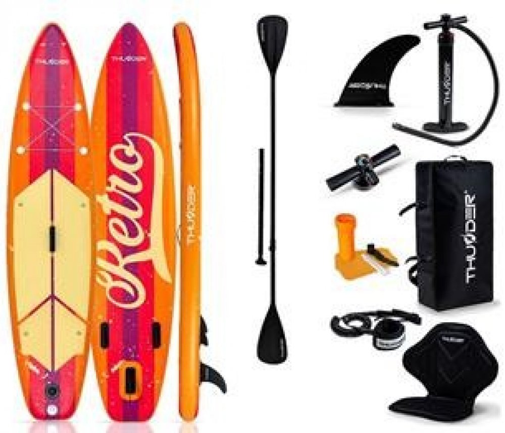 SUP board RETRO 320 THUNDER®️ S nafukovacím stand-up paddleboardem RETRO 320 od THUNDER®️ si můžete na vodě užívat flexibilitu, pohodlí a bezpečnost. Ideální pro začátečníky i pokročilé - pro funkci SUP nebo kajaku v jednom!Výhody výrobku: - je vybaven speciálními funkcemi, které umožňují rychlé a pohodlné jízdy: funkce 2 v 1 - SUP a kajak s možností pohodlného sezení Jádro s kapkovitým stehem (IDC) - pro výjimečnou stabilitu a tuhost Protiskluzová EVA paluba - pohodlí, přilnavost a kontrola Robustní kompozitní vrstva UAL s výztuhou z PVC a skelných vláken. Výztuha ze skelných vláken Vysokotlaký ventil - rychlé a těsné nafouknutí až do 15 PSI Kompaktní rozměry a snadná přeprava v 80litrovém batohu 3 ploutve pro vysokou sledovatelnost a ovladatelnost Vhodné pro turistiku, jezera, řeky a další Ideální pro všechny úrovně zkušenostíVybavení v sadě: Nafukovací SUP prkno THUNDER®️ RETRO 320 Sedačka na kajak se zadní kapsou Výškově nastavitelné hliníkové dvojité pádlo (162-215 cm)Dvojité pádlo (162-215 cm) Dvojitá zvedací pumpa Centrální ploutev (odnímatelná) Bezpečnostní vodítko - délka 1-3 m / obvod 15-20 cm Opravná sada Prostorný batoh (80 l) Tlakoměr 4 D-kroužky + elastická síťka na zavazadla Návod k obsluzeTechnické údaje: Délka: 320 cm Šířka: 75 cm Tloušťka: 15 cm Délka pádla: 162 - 215 cm Max. Tlak: 15 PSI Rozměry balení: 85 × 39 × 28 cm Hmotnost (včetně příslušenství): 12,5 kg Povrch z pěny EVA: 5 mm, protiskluzový a pohodlný IDC (I-Drop-Stitch-Core) - pevnost v tlaku a tahu Použití: Pro volný čas, sport a turistikuTHUNDER®️ RETRO 320 - styl se snoubí s výkonem na vodě. Vaše SUP vše v jednom pro maximální svobodu a dobrodružství!