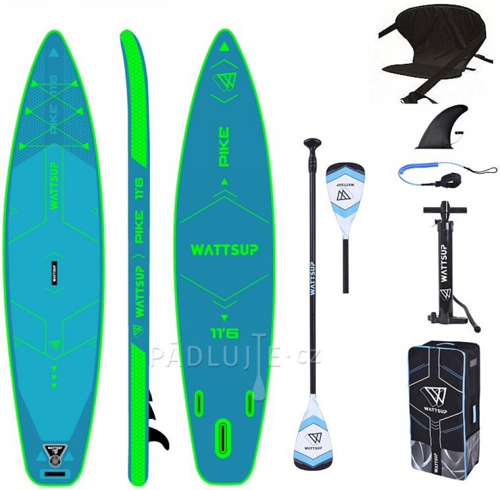 Touringový plovák WATTSUP PIKE 11'6'' s batohem, manuální pumpou a pojistným řemínkem. Vše co potřebujete k jízdě ve stoje.