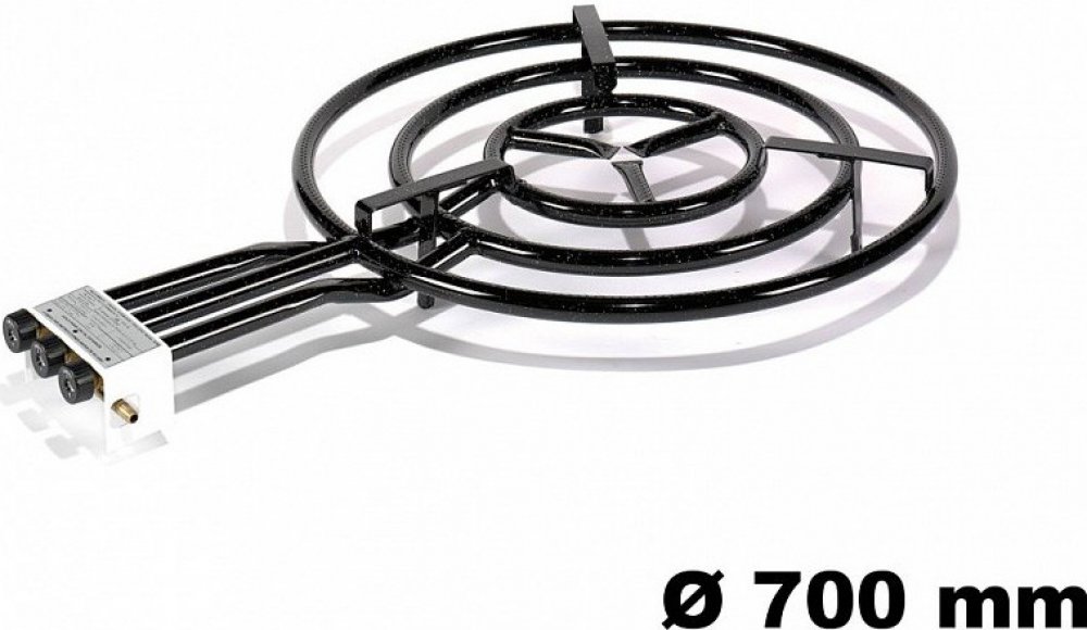Paella plynový gastro hořák průměru 70 cm, tří-kruhový na propan-butan, určený pro ocelové, litinové, nerezové nebo smaltované pánve. Hořák je vybaven plynulou regulací výkonu a pro zajištění rovnoměrného hoření na co největší ploše pod pánvemi je opatřen třemi soustřednými hořáky a tří-ramenným hořákovým středem. Každý z kruhových hořáků je zvlášť regulovatelný.