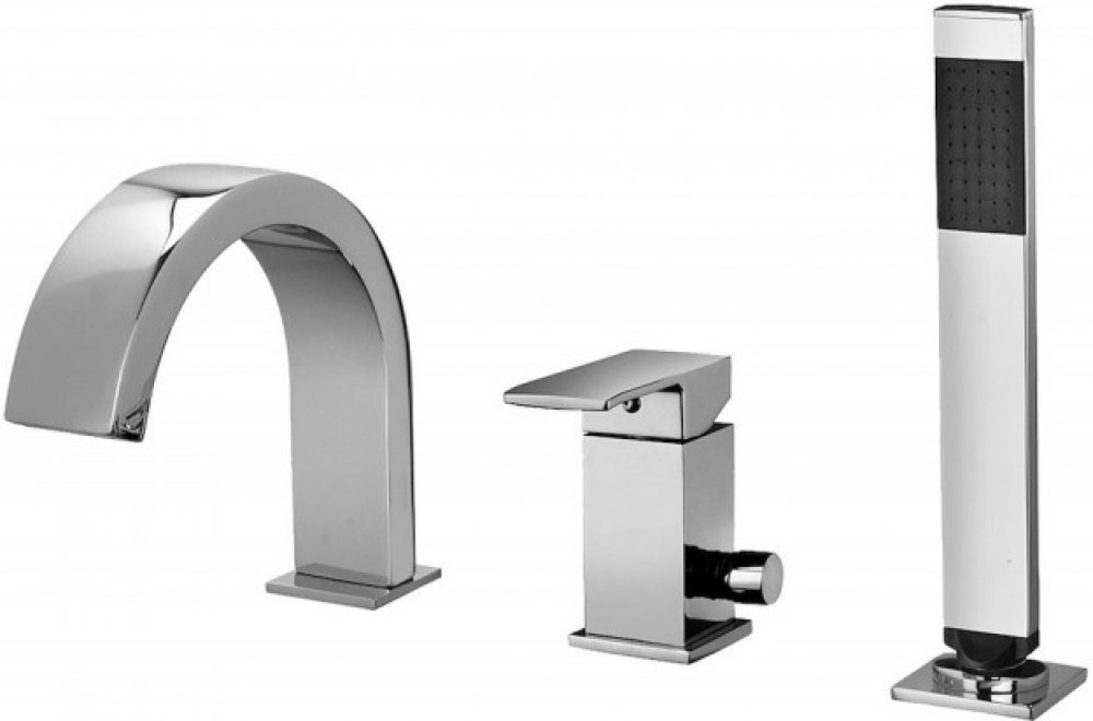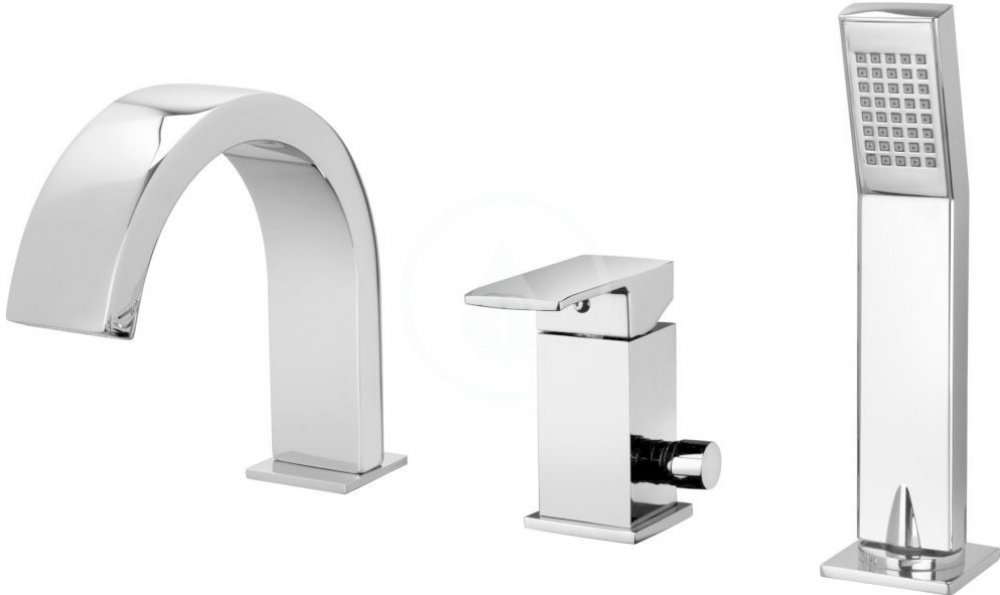 Vanová tříotvorová stojánková páková baterie 3 vývody vytahovací ruční sprcha raménko bez perlátoru přepínač set 5 nerezových hadic flexibilní hadice se závažím pro ruční sprchu povrchová úprava chrom Baterie je určena pro montáž do otvoru vany.