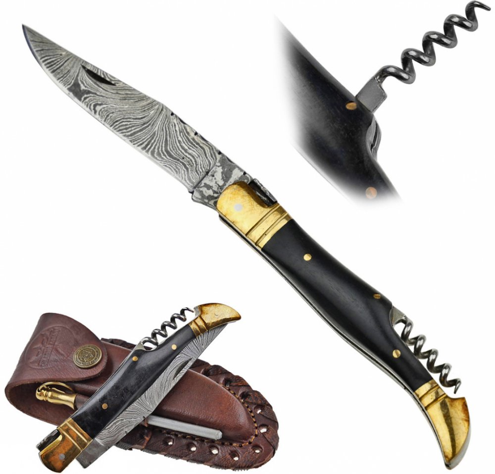 Rukojeť tohoto nože "DON CORLEONE" je opravdovým uměleckým dílem. Tělo rukojeti je z kvalitní oceli, na které je jako první vrstva příložek uchycená mosaz. Jako finální vrstva příložek je použitá leštěná ocel společně s černě mořeným dřevem, která je z obou stran ohraničené zakončeními z leštěné. Součástí rukojeti je také vývrtka na otevírání korkových zátek, především na víno. Celá rukojeť je pak zpevněná mosaznými nýtky, které vyztužují celou konstrukci.