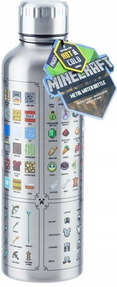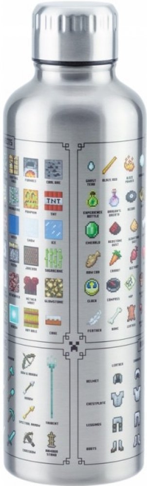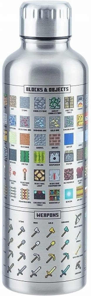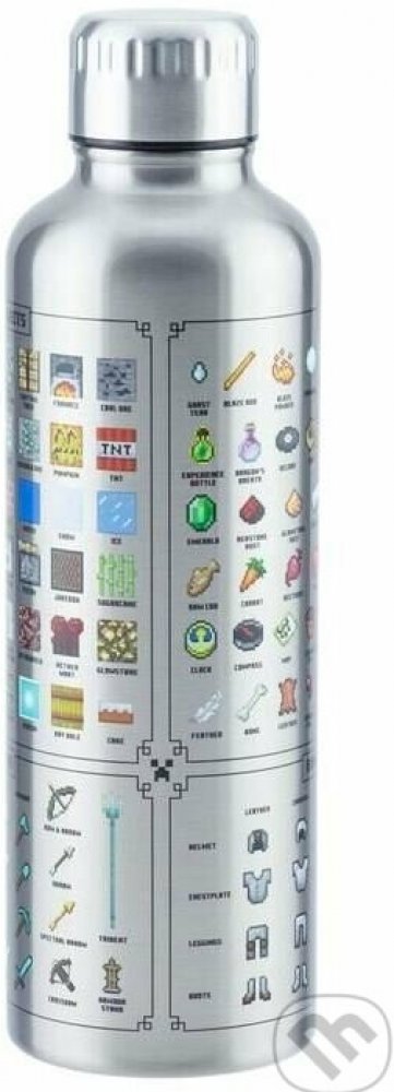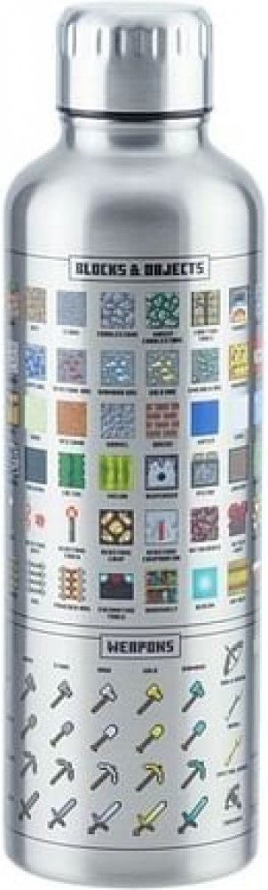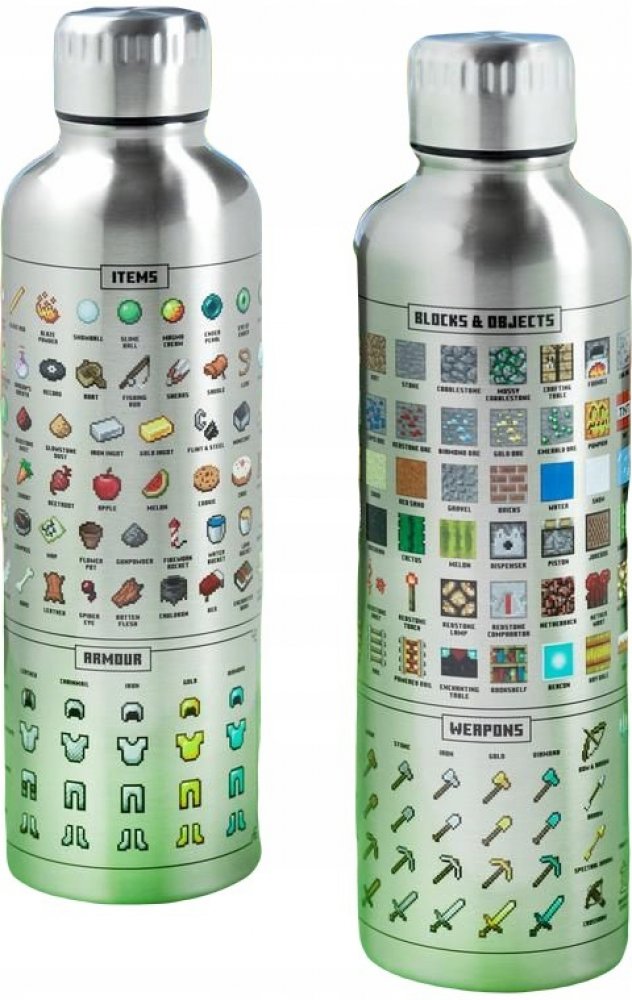 Nerezová láhev s ikonami zbraní, brnění, bloků a předmětů z Minecraftu. Dvouvrstvá nerezová láhev na vodu je skvělá na cesty i pro použití doma nebo v kanceláři.