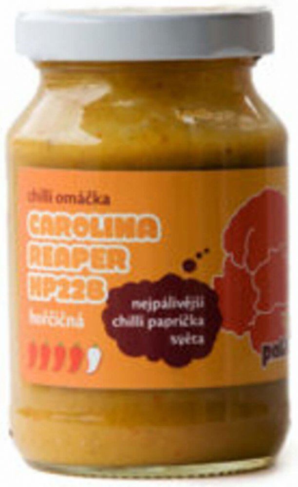 Palito Carolina Reaper - hořčičná chilli omáčka 200 ml Chuť hořčičné chilli omáčky vyráběné z nejpálivější chilli papričky světa Carolina Reaper HP22B a její ovocné aroma, které dává tušit vyváženou kombinaci kvalitní hořčiče s exotickým mangem, doplňěnou vůní z vlastnoručně namleté a namíchané Kari směsi. Omáčka se výborně hodí jako ochucovadlo ke grilovaným masům, přísada do marinád, nebo jen tak k párečkům s chlebem. Složení: plnotučná hořčice (50%), mango, cukr, vinný ocet, chilli papričky Carolina Reaper (6%) směs kari koření. Druh papriky: Capsicum Chinense - Carolina Reaper Carolina Reaper - hořčičná chilli omáčka je Mangovo hořčičná omáčka s kari směsí a nejpálivější papričkou Carolinou Reaper (5%).