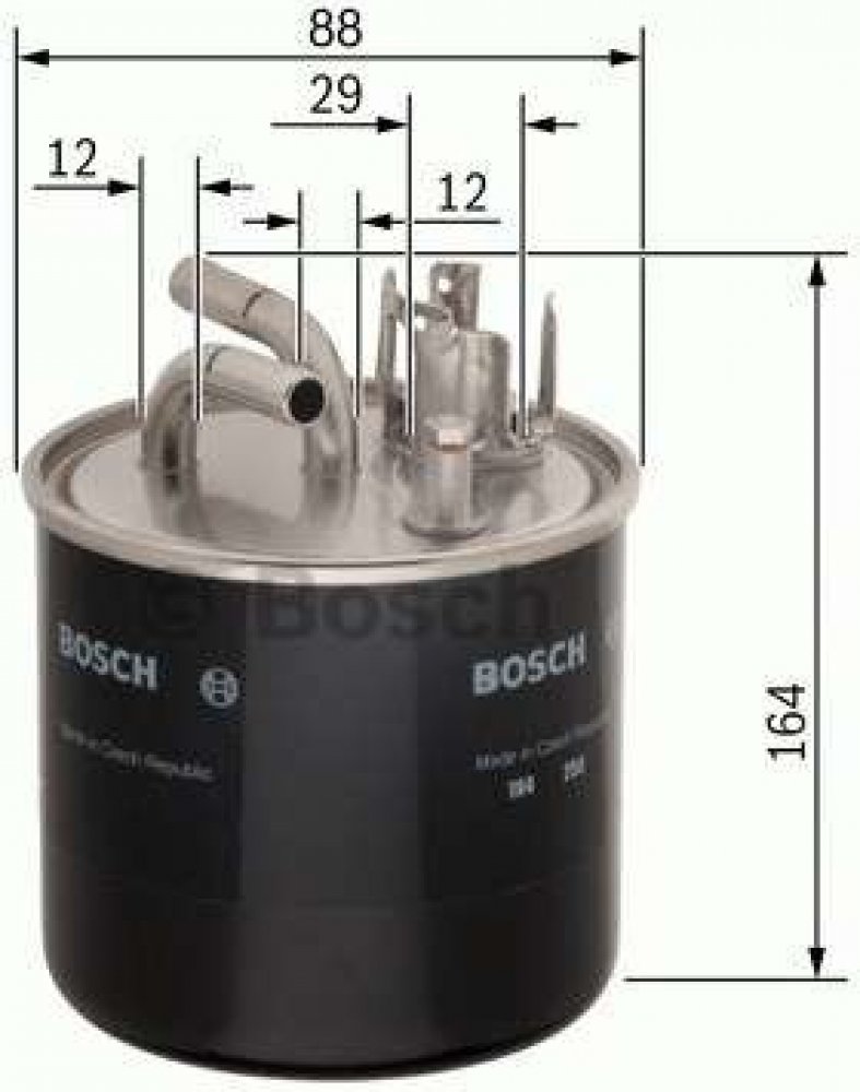Filtr zabudovaný do potrubí, průměr v mm: 88 mm, průměr 2: 29 mm, průměr 3: 12 mm, průměr 4: 12 mm, výška [mm]: 164 mm, průměr vstupu [mm]: 8 mm, odtok [mm]: 8 mm