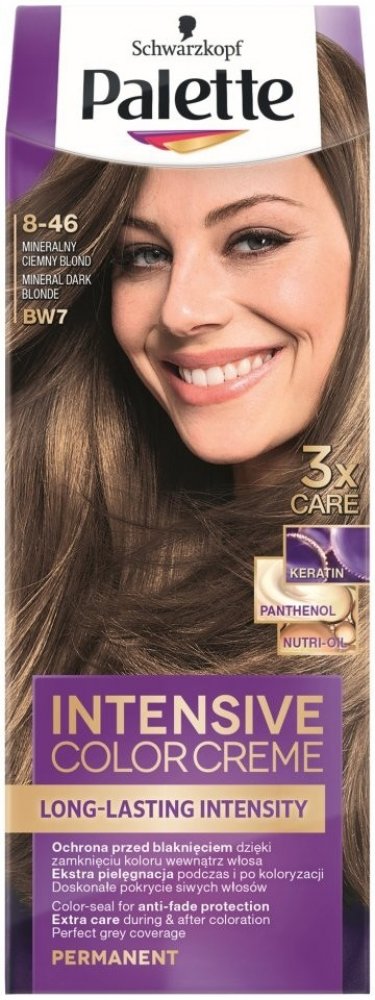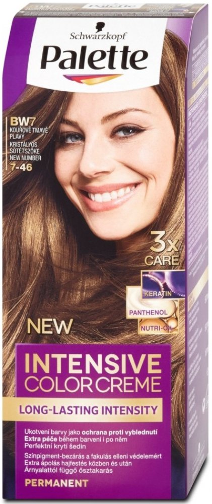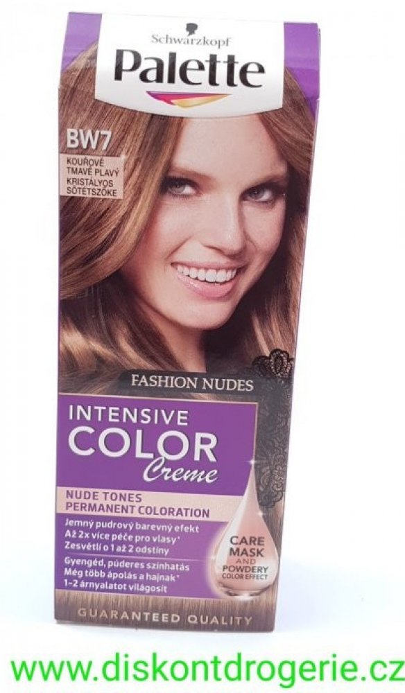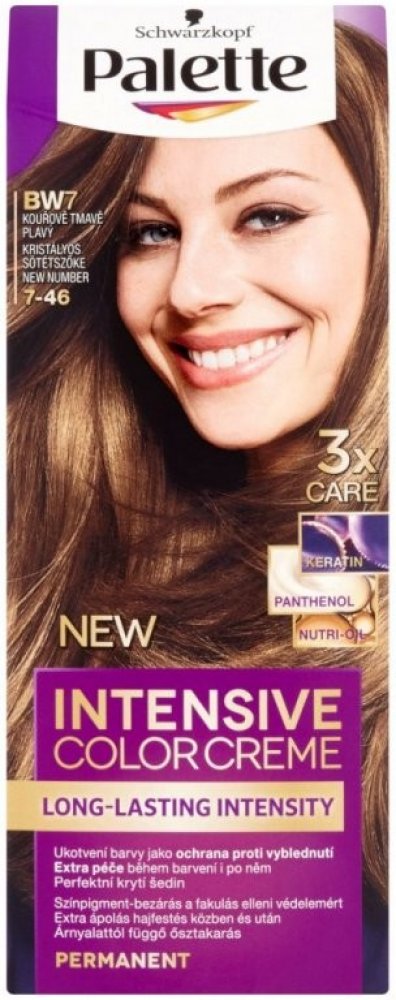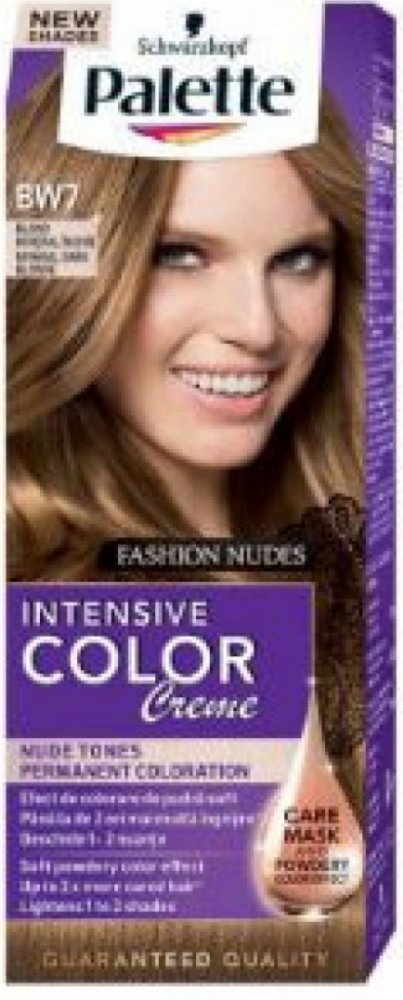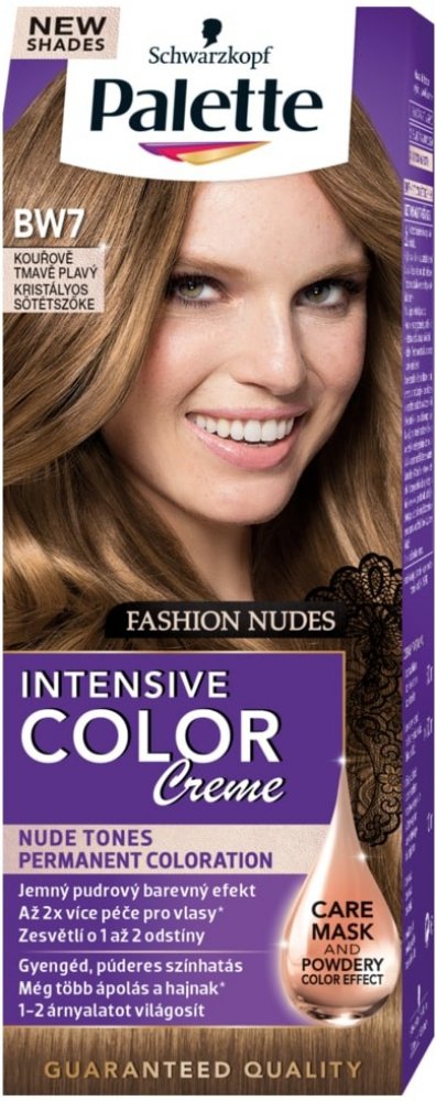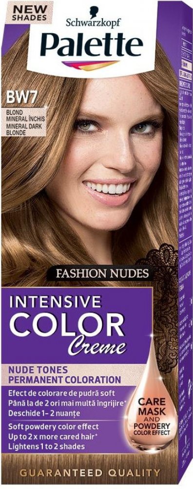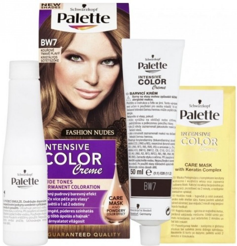 Palette Intensive Color Creme pro intenzivní dlouhotrvající barevný výsledek Barvicí směs proniká hluboko do vlasů uzavírá v nich vysoce intenzivní pigmenty a poskytuje jim zesvětlení o 1 až 2 odstíny Speciální mix pigmentů vlasy zesvětlí a zároveň dodá výsledné barvě pudrový efekt pro přirozeně vypadající odstín Receptura a pečující maska spolu se systémem trojí péče Keratin Panthenol a NutriOil se dokonale postarají o vaše vlasy Vlasy tak dostávají více péče a jsou silnější hebčí a zářivé