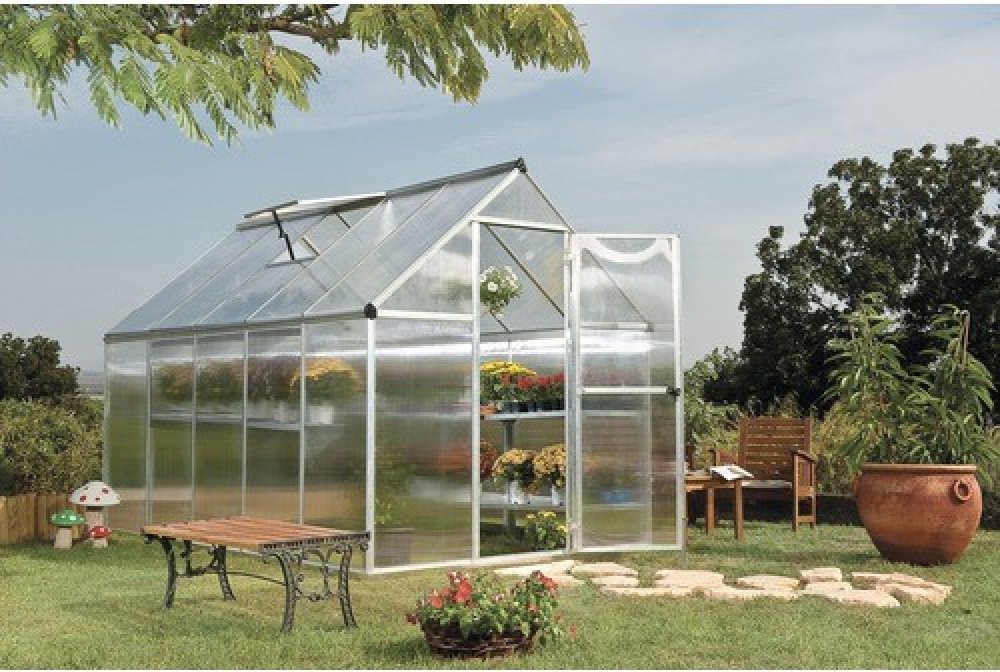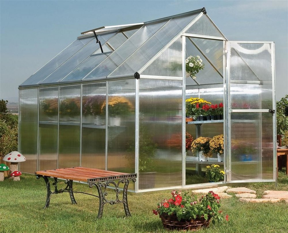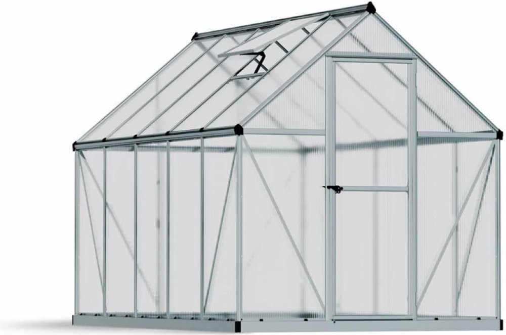 Palram 5.74 m2 1.85 m 3.06 m 2.09 m 1.71 m 30 kg se sedlovou střechou hliníkové stříbrné jednokřídlé polykarbonát 4 mm