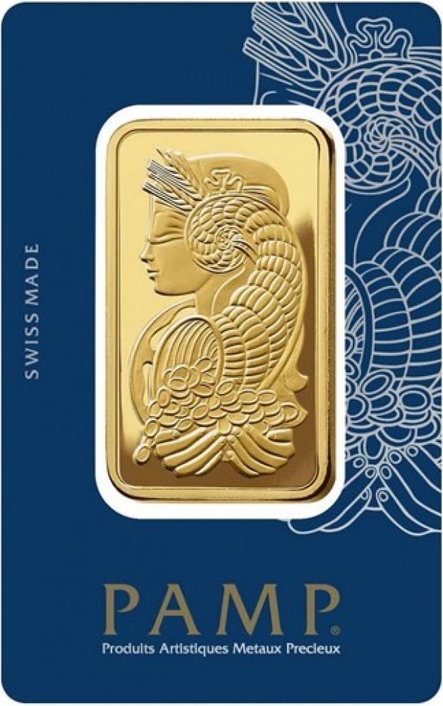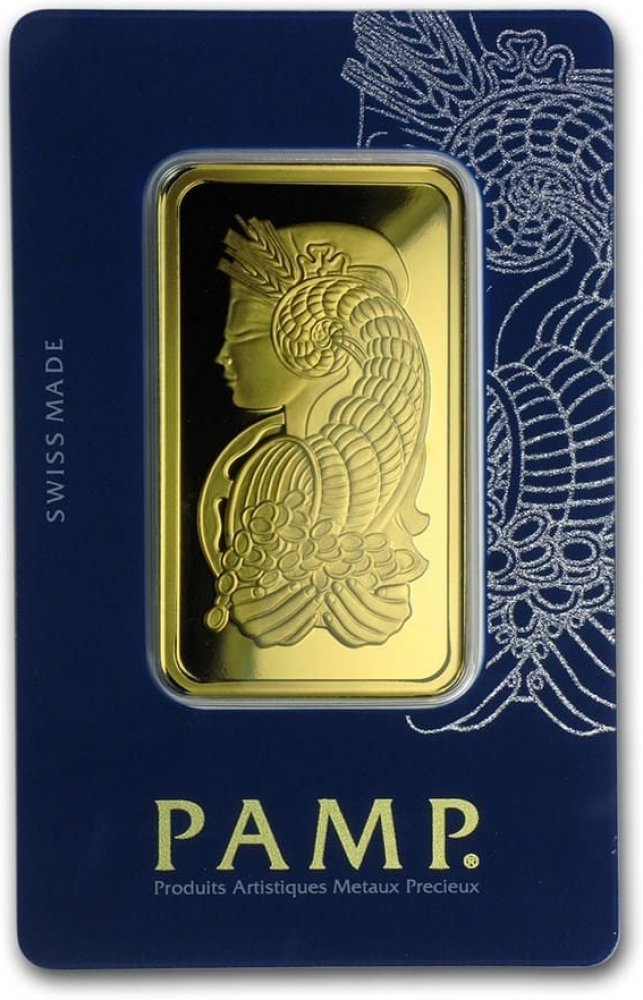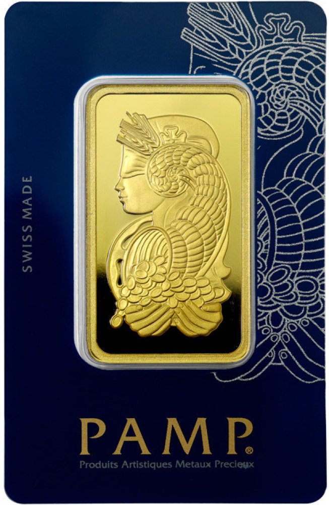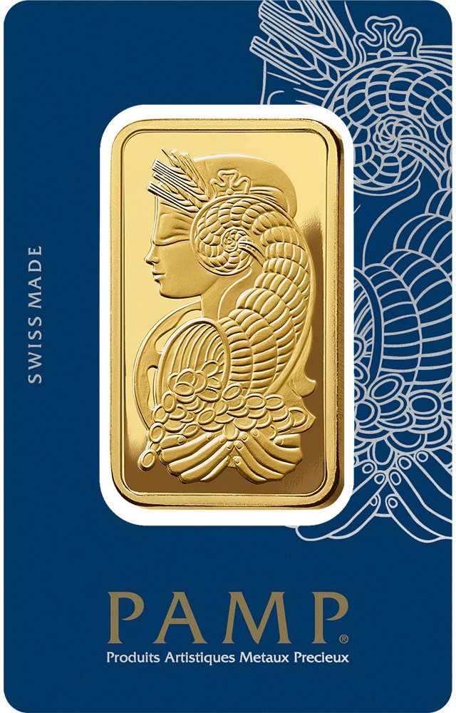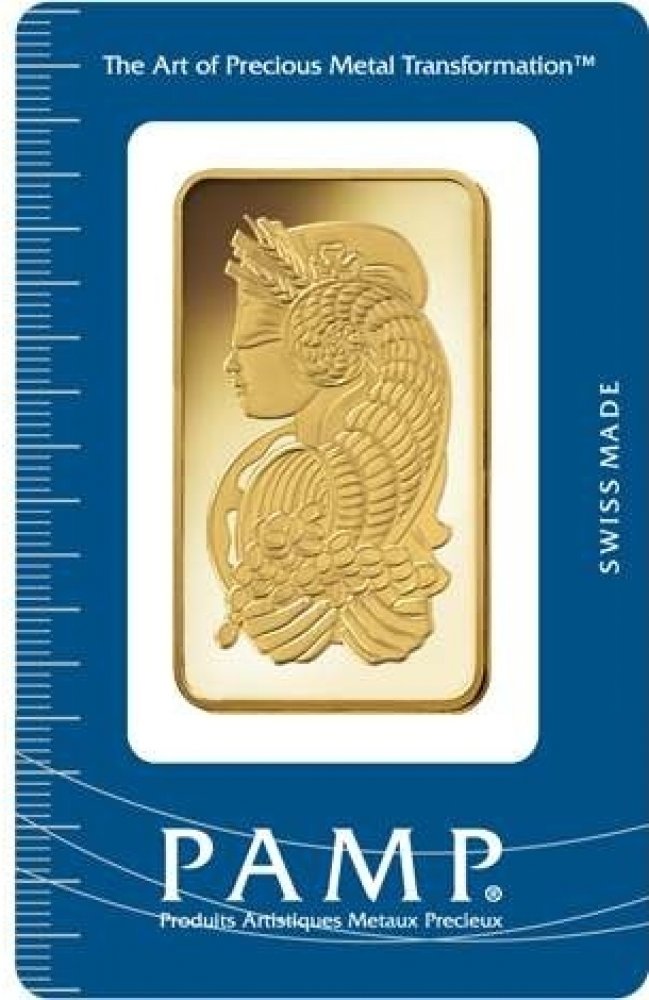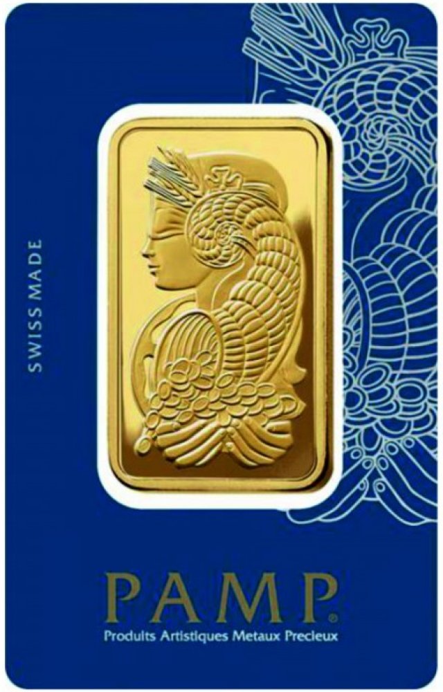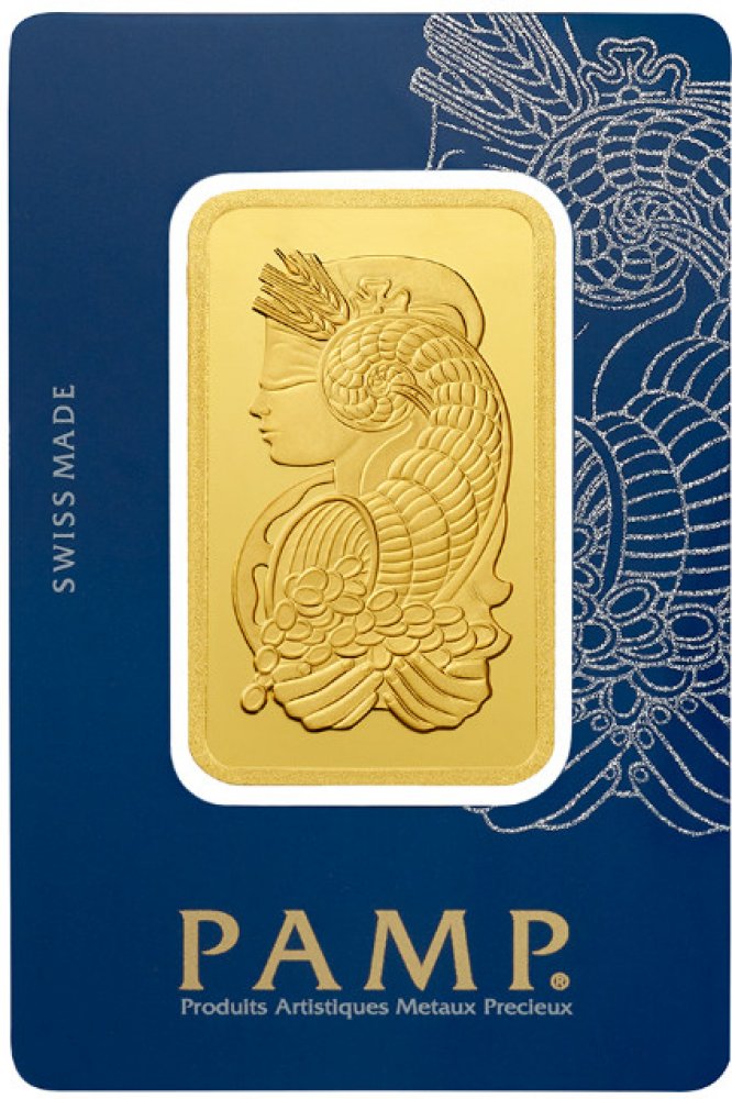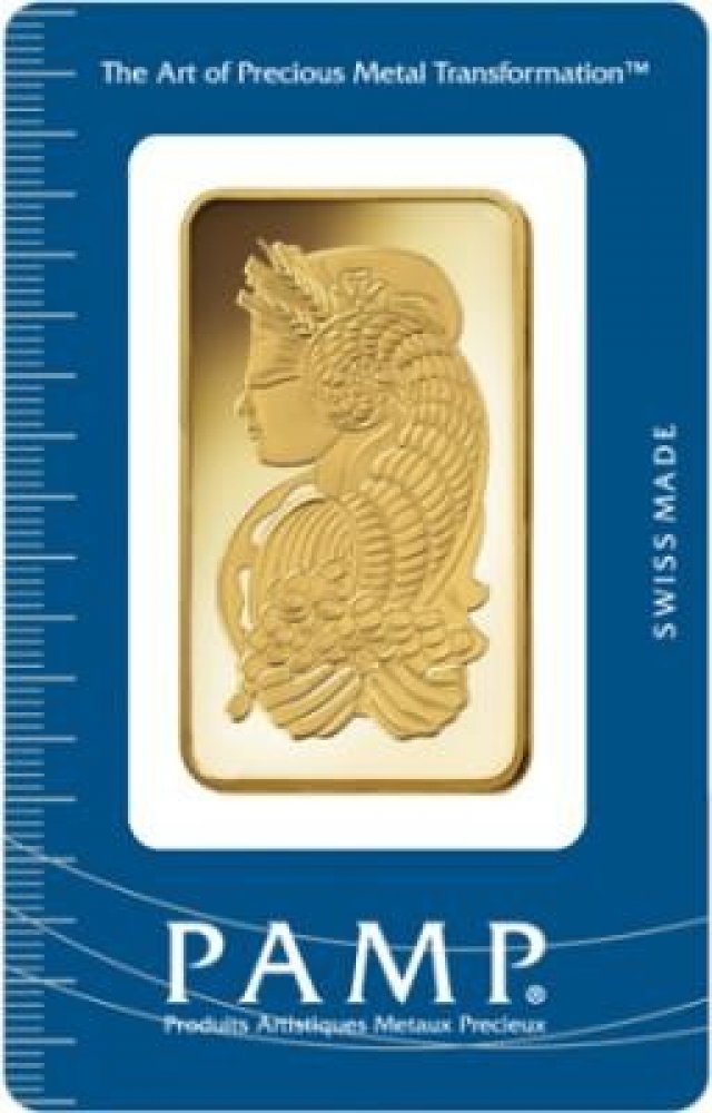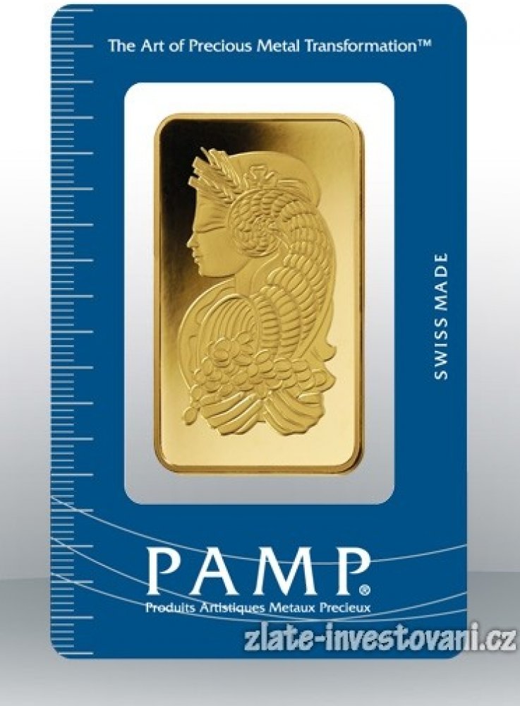 Zlaté slitky z ryzího zlata (999.9 Fine Gold), certifikované švýcarskou firmou PAMP SA. Slitek je zataven v plastu s číslem a certifikátem. Slitek je dodáván s motivem Fortuny římské bohyně šťastné náhody (řecké Tyché), tato bohyně je známá tím, že se usmívá na všechny, kdo hledají její přízeň a sype jim z rohu hojnosti. Unikátní číslo a váha jsou uvedeny na svrchní straně slitku. Rafinérie PAMP S...