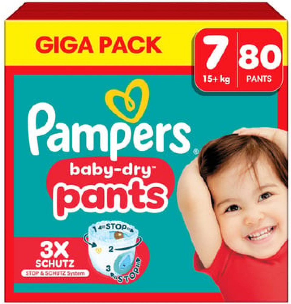 Podrobnosti o produktu: Pampers Baby-Dry Pants, vel. 7 Extra Large 15+kg, Giga Pack3x ochrana díky systému Stop & Protection: 2x širší* manžety zabraňující úniku vody kolem nohou (*než dříve).Kapsa Stop & Protect zabraňující protékání v zadní části.360° střih se přizpůsobí pohybům vašeho aktivního dítěte.Se superabsorpčním jádrem, které okamžitě absorbuje tekutinuSnadná výměna plenek: pro nasazení...