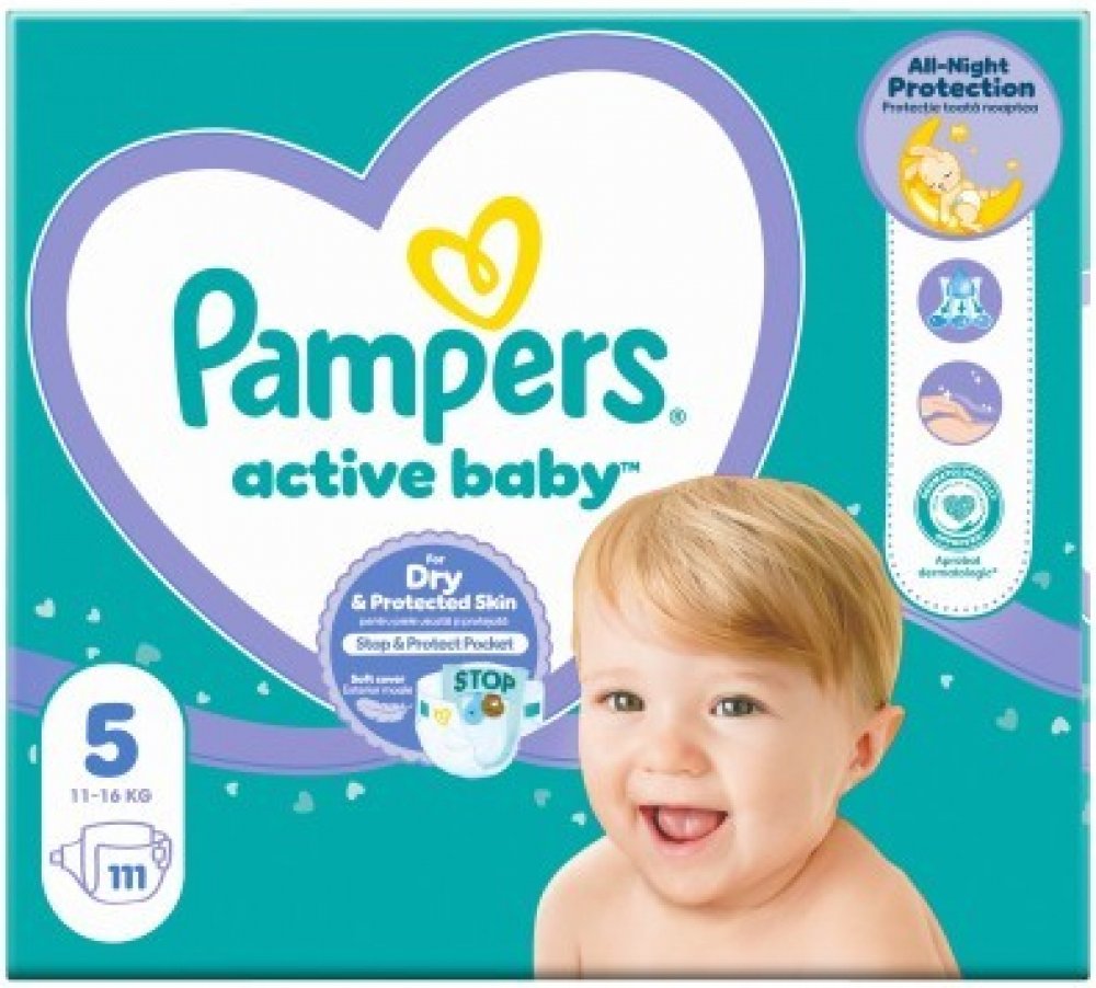 Dětské pleny Pampers Active Baby vel. 5 Monthly Pack 11–16 kg disponují jedinečnou vrstvou navíc, která rychle absorbuje vlhkost až na 12 hodin. Plenka Pampers pomáhá udržet vaše děťátko v suchu a pohodlí po celou noc. Dermatologicky testované. Plenky jsou jemně parfemované pečlivě vybranými parfémy, které nejsou klasifikované jako alergeny. Balení 111 ks.