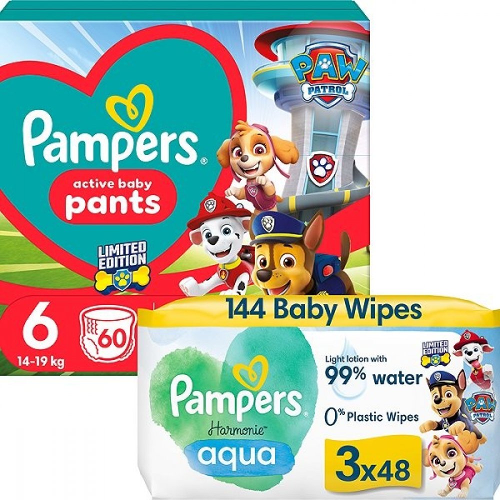 Plenkové kalhotky Pampers Active Baby Pants Paw Patrol jsou tou pravou volbou pro aktivní šikuly a také milovníky Tlapkové patroly. Limitovaná edice potěší děti obrázky oblíbených akčních psíků záchranářů. Plenkové kalhotky se snadno oblékají jedním tahem, a tak se nebudete muset nijak zdržovat. Rovněž se snadno svlékají, stačí je roztrhnout na bocích. Komfortní ochrana 360° FIT brání protečení až po 12 hodin, navíc jsou vybaveny kapsou Stop & Protect, která předchází protečení vzadu. Součástí balení jsou také vlhčené ubrousky Harmonie Aqua Paw Patrol, které obsahují lehké pleťové mléko a 99 % vody. Jsou speciálně navrženy pro citlivou pokožku novorozenců i starších dětí, dají se používat na zadeček, obličej a ručičky a obsahují 0 % parfemace, alkoholu a plastů. 6 Velikost 14-19 kg Hmotnost dítěte 60 ks Počet ks v balení Klíčové vlastnosti plenkových kalhotek Pampers...