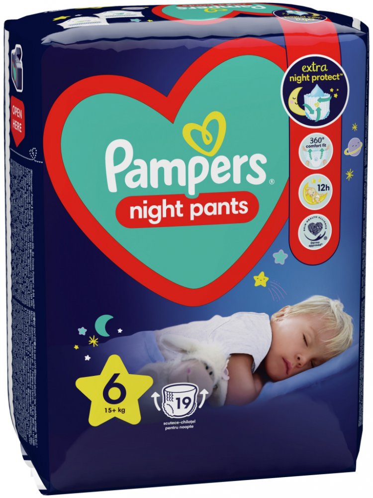 Plenkové kalhotky Pampers Night Pants poskytují lepší ochranu pro klidný spánek po celou noc* díky zesílenému jádru, které okamžitě absorbuje vlhkost pro až 12 hodin v suchu.
