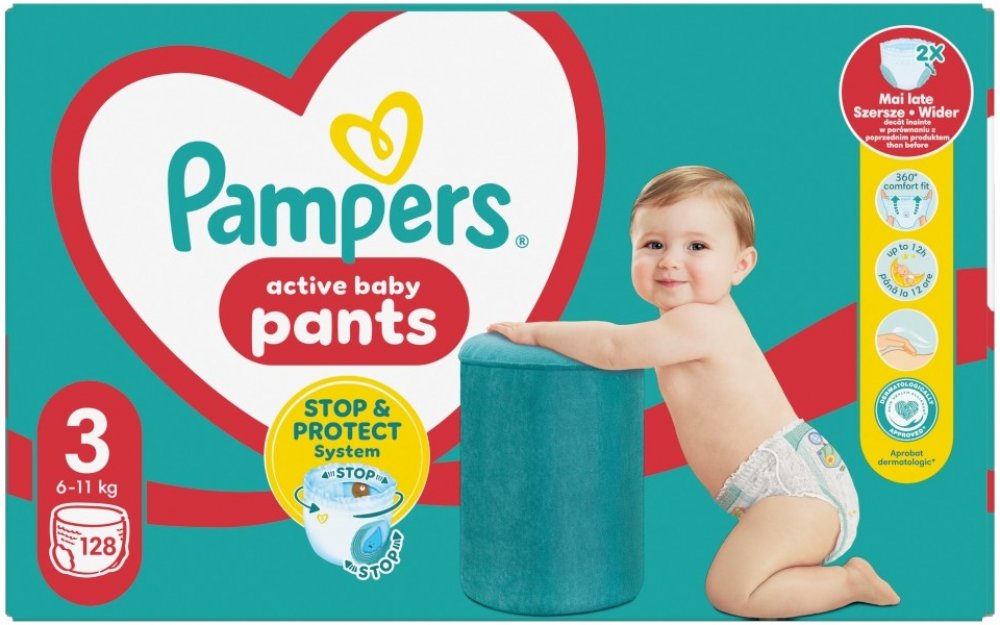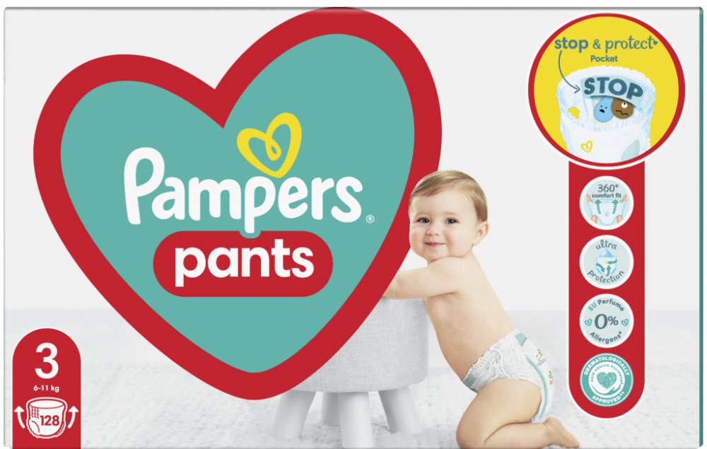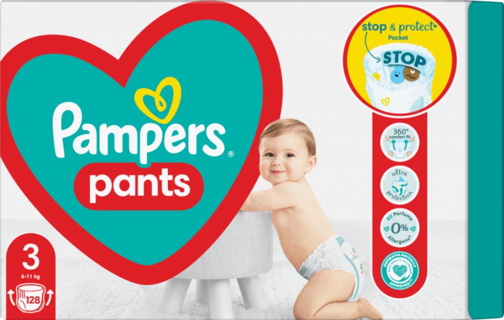 Plenkové kalhotky Pampers Pants s revoluční KAPSOU STOP & PROTECT, která spolu s dokonale padnoucím pružným pasem poskytuje až 12 hodin úplné ochrany proti protečení.