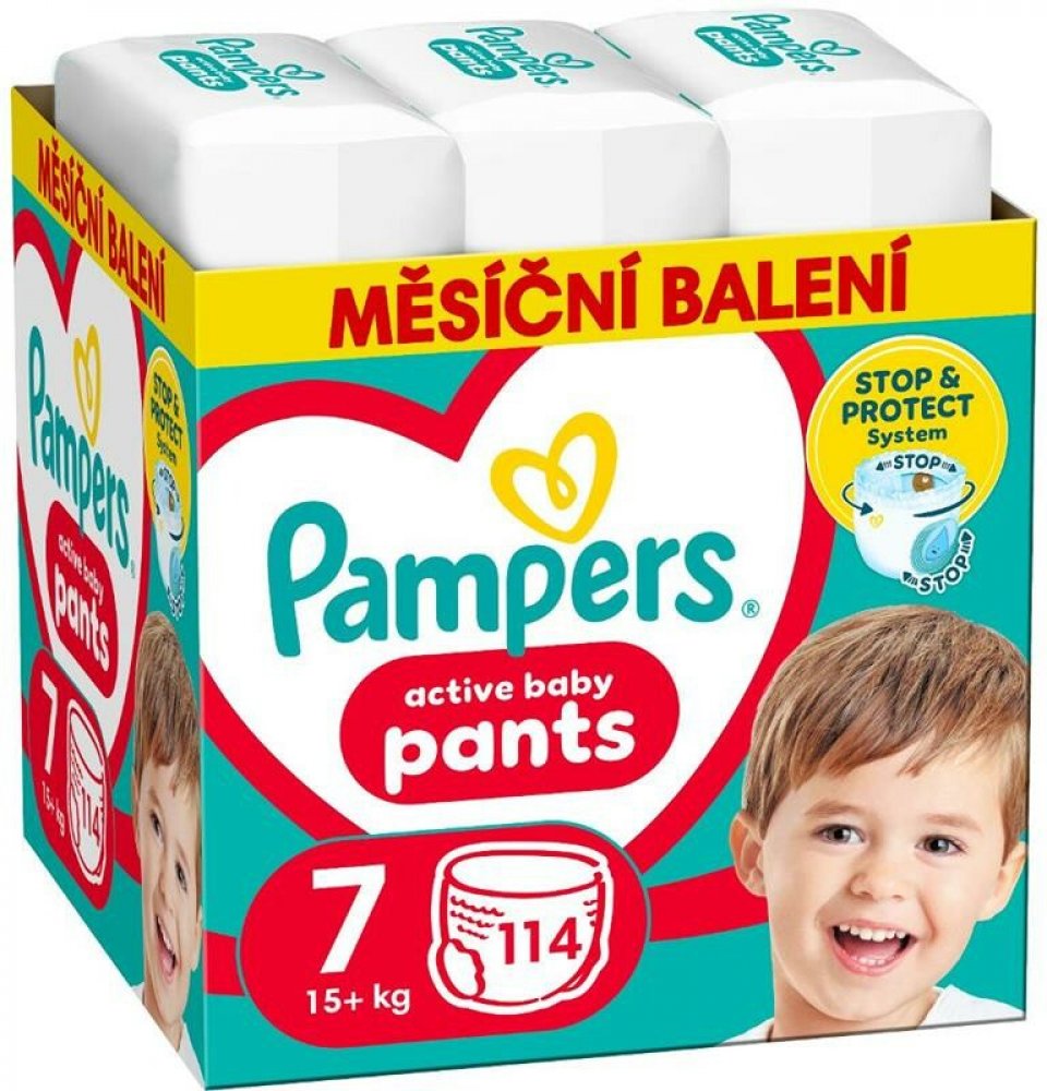 Když vaše děťátko začne být aktivnější, chcete plenku, která udrží krok s jeho novými pohyby. Plenkové kalhotky Pampers Active Baby Pants s revolučním systémem Stop & Protect nabízejí vynikající úplnou ochranu před protečením po celý den i noc a bez ohledu na polohu vašeho děťátka. Plenkové kalhotky Pampers Active Baby Pants se systémem Stop & Protect mají 2× širší* manžetky na nožičkách, které pomáhají předcházet protečení kolem nožiček, kapsu, která pomáhá zabránit protečení vzadu, 360° pružný pas, který se přizpůsobí tvaru těla vašeho děťátka při jakémkoli pohybu, a super absorpční jádro, které nabízí až 12hodinovou ochranu. Plenkové kalhotky Pampers Active Baby Pants se stejně jako všechny plenkové kalhotky od Pampers snadno vyměňují, i když je vaše děťátko neposedné: oblékají se jedním tahem a svlékají se roztrhnutím na bocích. Potom je stačí srolovat a zajistit páskem pro snadnou likvidaci. Stejně jako pro vás je i pro Pampers bezpečnost vašeho děťátka prioritou: Plenkové kalhotky Pampers Active Baby Pants jsou dermatologicky testované a schválené dermatology z organizace Skin Health Alliance. Chcete se o složení výrobků Pampers dozvědět víc? Navštivte pampers.cz. *v porovnání s předchozí plenkou