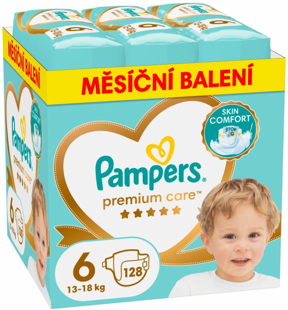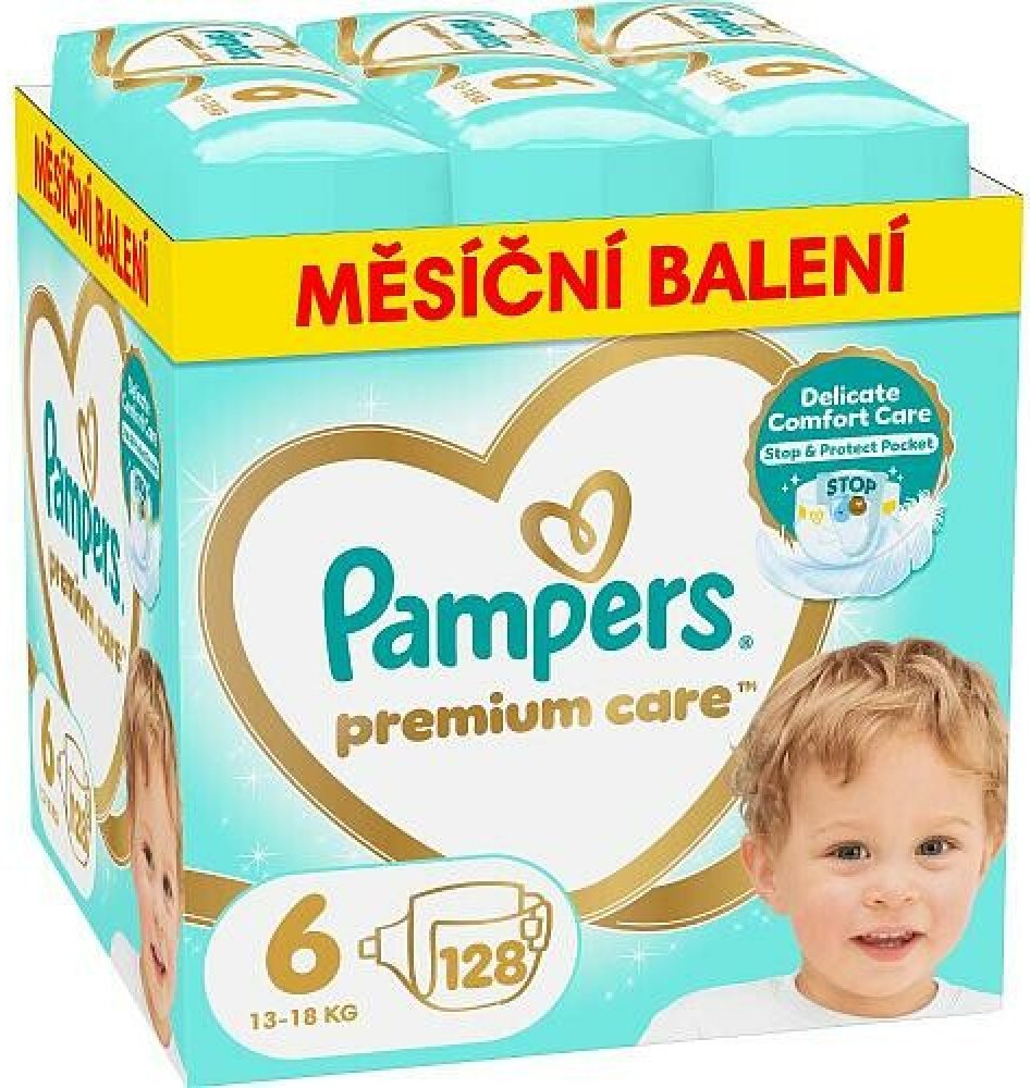 Plenky Pampers Premium Care 6 (13–18 kg) jsou navrženy tak, aby chránily citlivou pokožku dětí. Nadýchaný hebký materiál poskytuje pohodlí i ochranu. Jsou dermatologicky testované a neobsahují žádné parfémy klasifikované jako alergeny.Kapsa Stop & Protect navíc pomáhá zabraňovat protečení vzadu.Vrstva Dermacomfort s absorpčními póry odvádí vlhkost a nečistoty od pokožky.Systém zabezpečení rychle absorbuje tekutinu a pomáhá předcházet protečení v pase a kolem nožiček.Okamžitá absorpce - miliony mikropórů absorbují vlhkost a nečistoty, odvádějí je od pokožky a udržují tak citlivou pokožku dítěte v suchu a chráněnou.Balení obsahuje 128 ks.