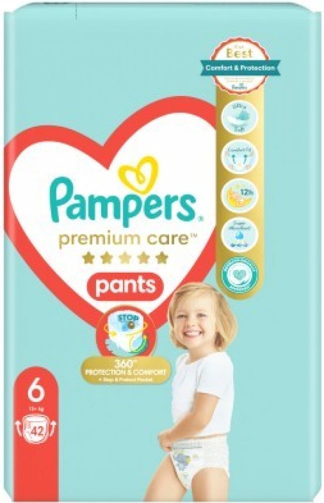 PAMPERS Premium Care Pants Plenkové kalhotky vel. 6, 15+ kg, 42 ks Plenkové kalhotky Pampers Premium Care velikost 6 od 15kg. Plenkové kalhotky, které se snadno oblékají, pro nejlepší pohodlí a ochranu.