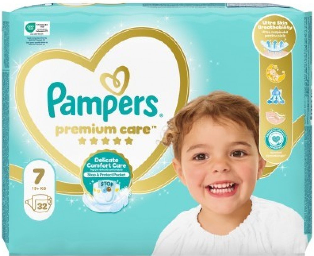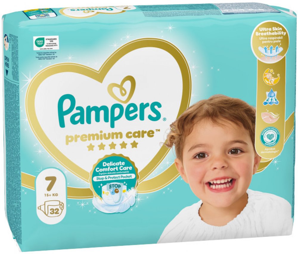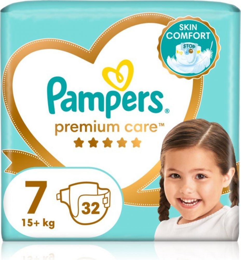 PAMPERS Premium Care velikost 7, 15kg+, 32 ks Dvojí ochrana díky okamžité absorpci a kapse Stop & Protect zabraňující protečení. Pohodlí pro pokožku: nejhebčí pohodlí od Pampers s miliony mikropórů, které odvádí řídkou stolici od pokožky.