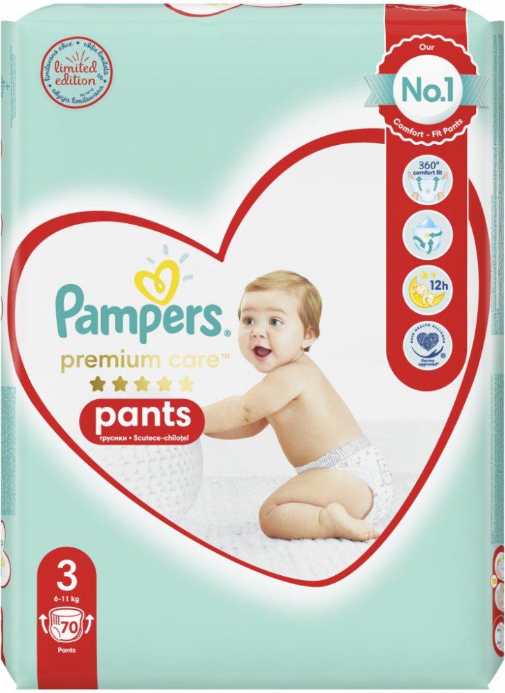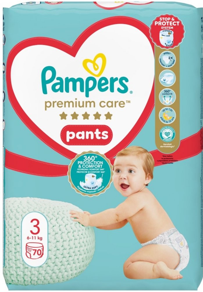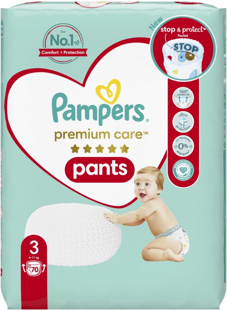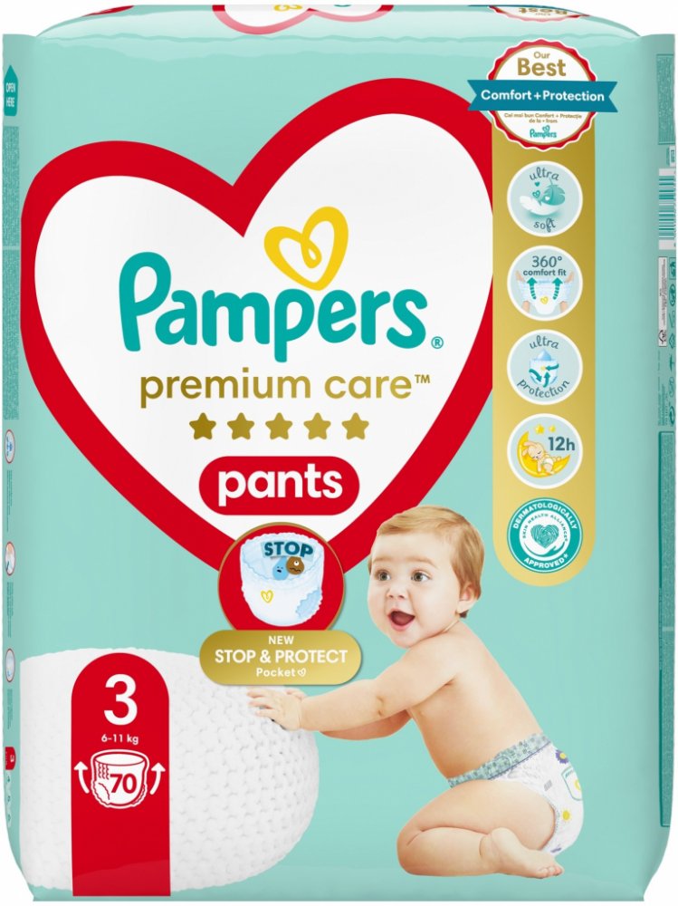 Jakmile začne být vaše děťátko aktivnější, budete potřebovat takovou plenku, která mu pohodlně padne a dokáže je spolehlivě chránit při každém pohybu. Dopřejte svému děťátku nejlepší pohodlí a ochranu před protečením od Pampers s plenkovými kalhotkami Pampers Premium Care Pants: jejich 2× širší* hebké manžetky chrání před zarudnutím a protečení, jejich ultra hebký pružný pas 360° FIT se přizpůsobuje pohybům vašeho děťátka při objevování světa a jejich jedinečná kapsa Stop & Protect pomáhá zabránit protečení vzadu. Plenkové kalhotky Pampers Premium Care se stejně jako všechny plenkové kalhotky od Pampers snadno přebalují, i když je vaše děťátko neposedné: oblékají se jedním tahem a svlékají se roztrhnutím na bocích. Potom je stačí srolovat a zajistit páskem pro snadnou likvidaci. Stejně jako pro vás je i pro Pampers bezpečnost vašeho děťátka prioritou: Plenkové kalhotky Pampers Premium Care Pants jsou dermatologicky testované a schválené dermatology z organizace Skin Health Alliance. Chcete se o složení výrobků Pampers dozvědět víc? Navštivte pampers.cz. *v porovnání s předchozím modelem.
