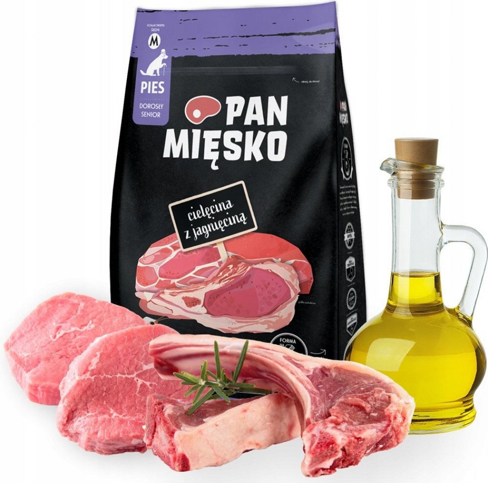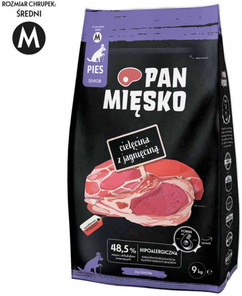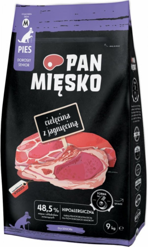 Pan Mięsko Telecí maso s jehněčím masem je formulace připravená na základě zvláštních potřeb starších psů. Obsahuje odpovídající množství výživných bílkovin přizpůsobených věku. Snížené množství tuku pozitivně ovlivňuje funkci jater a slinivky zralého organismu. Přídavek omega-3 kyselin, glukosaminu a chondroitin sulfátu pomáhá podporovat zdravé klouby a přídavek taurinu – srdce. V této formuli jsme nahradili výživný hrách lehce stravitelnými batáty a bramborami, díky čemuž je krmivo s podporou extraktu z Yucca Mojave a přídavkem prebiotik MOS a FOS lehce stravitelné a má pozitivní vliv na trávicí a trávicí systém.