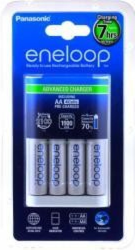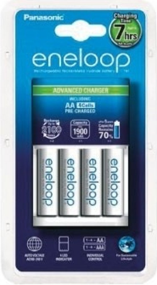 Nabíječka pro rychlé nabíjení jednoho až čtyř AA nebo AAA akumulátorů. Čtyři nezávislé nabíjecí pozice. Pulzní nabíjení řízené mikroprocesorem s detekcí delta V ukončí nabíjení přesně v okamžiku plného nabití.- nabíjecí proud AA aku - 300 mA (přibližná doba nabíjení AA Eneloop je 7 hodin, AA Eneloop Pro 9 hodin).- nabíjecí proud AAA aku - 150 mA (přibližná doba nabíjení AAA Eneloop je 6 hodin, AAA Eneloop Pro 7 hodin). LED kontrolka nabíjení pro každou baterii zvlášťrozměry (d x š x v): 105 x 65 x 27 mm. Váha 97 gramů. Napájení 100-240 VAC, 50-60 Hz. Součástí dodávky je nabíječka a čtyři kusy AA Panasonic Eneloop. Cena za ks.