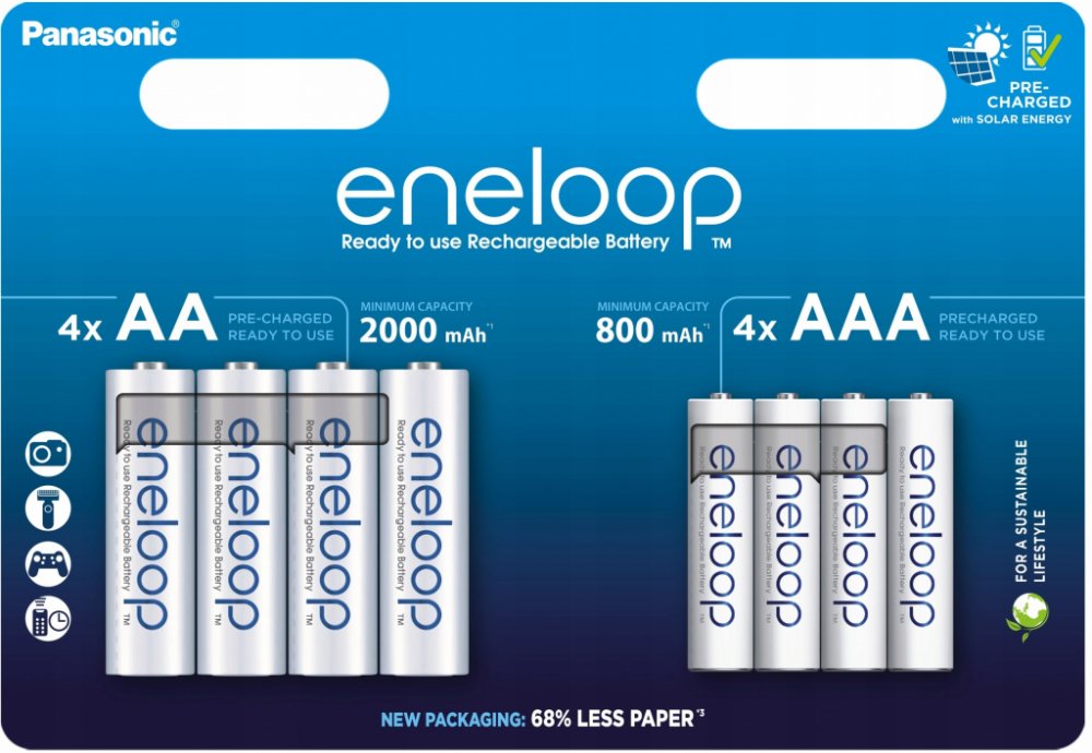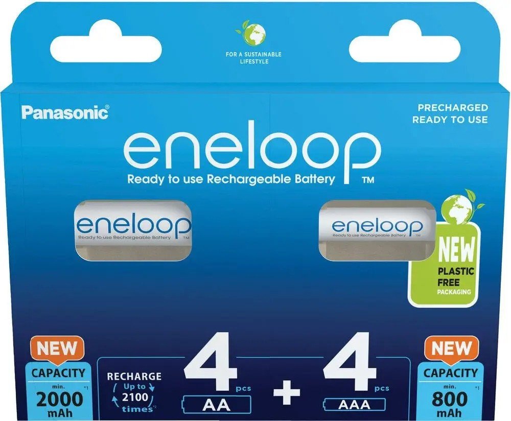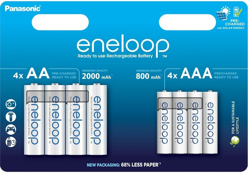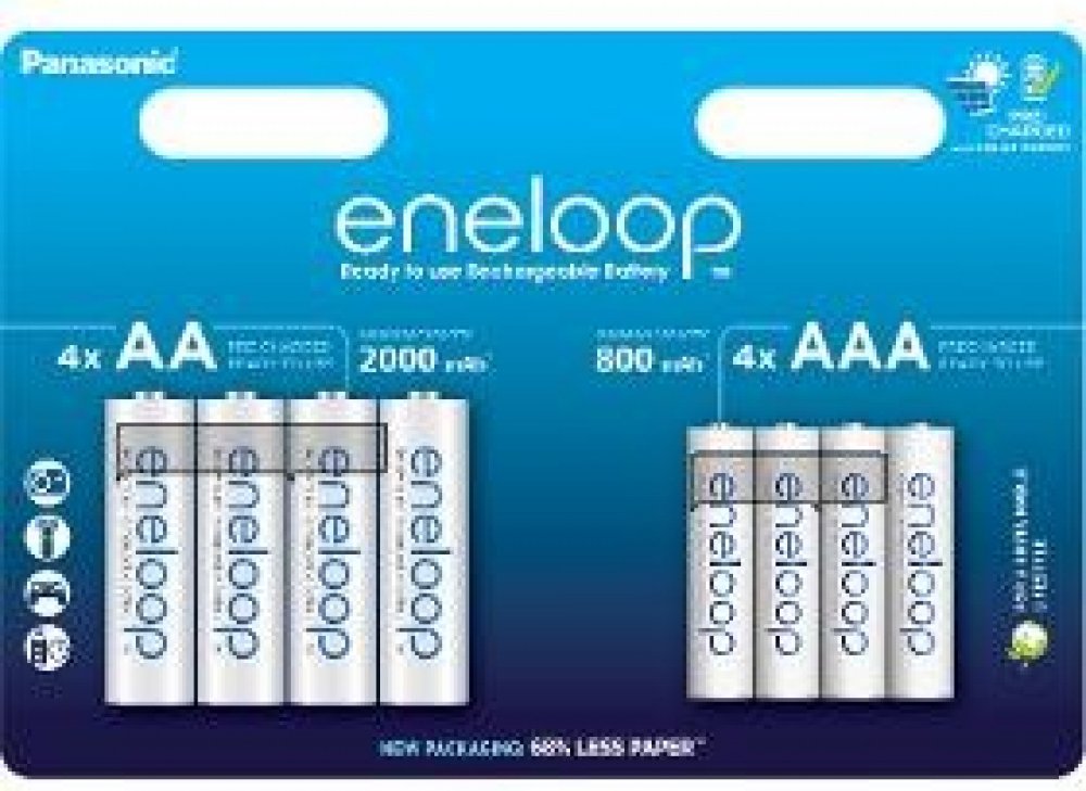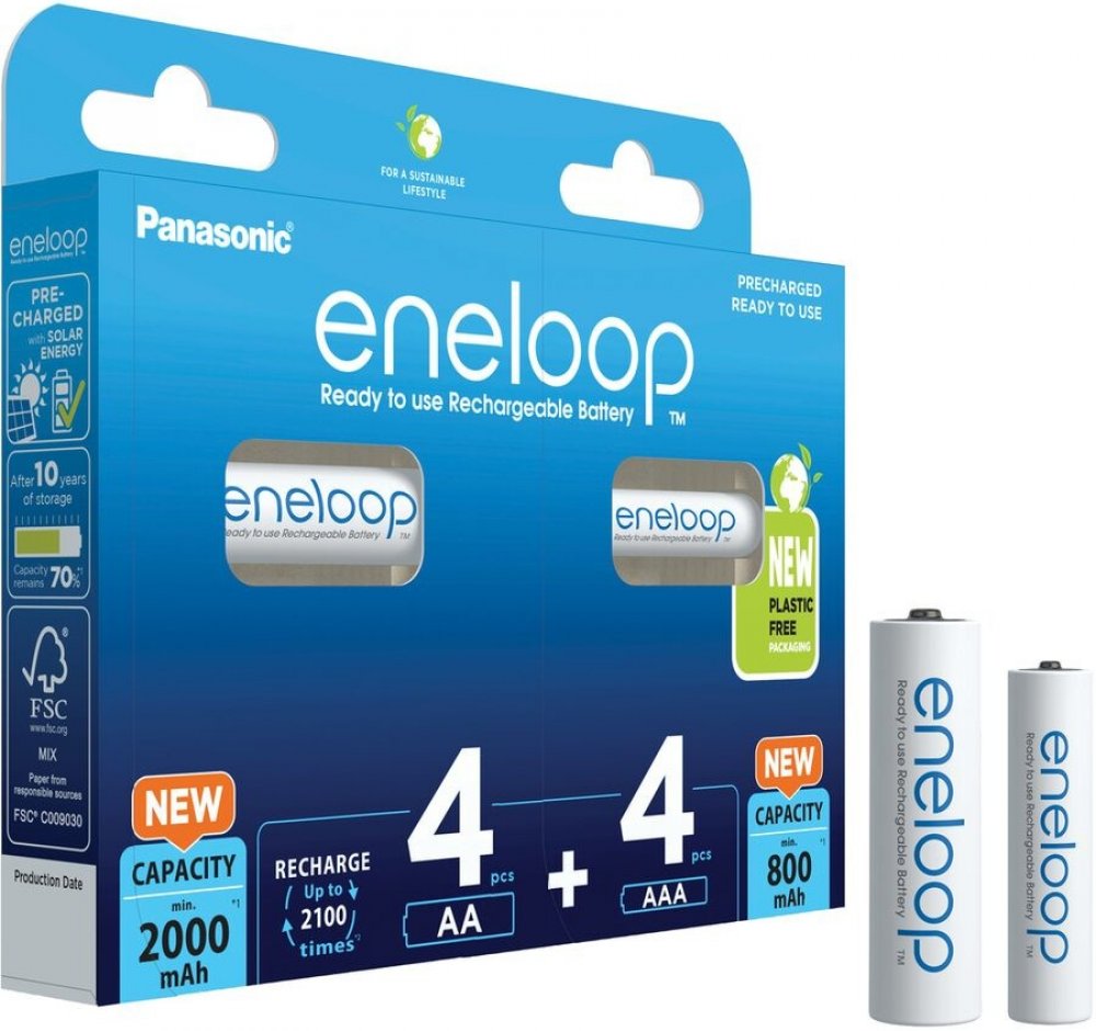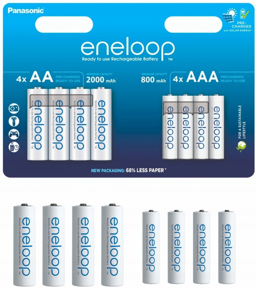 Toto balení Eneloop obsahuje 4 baterie AA a 4 baterie AAA.