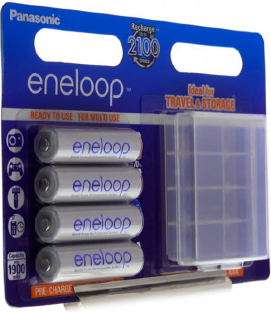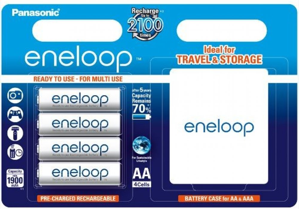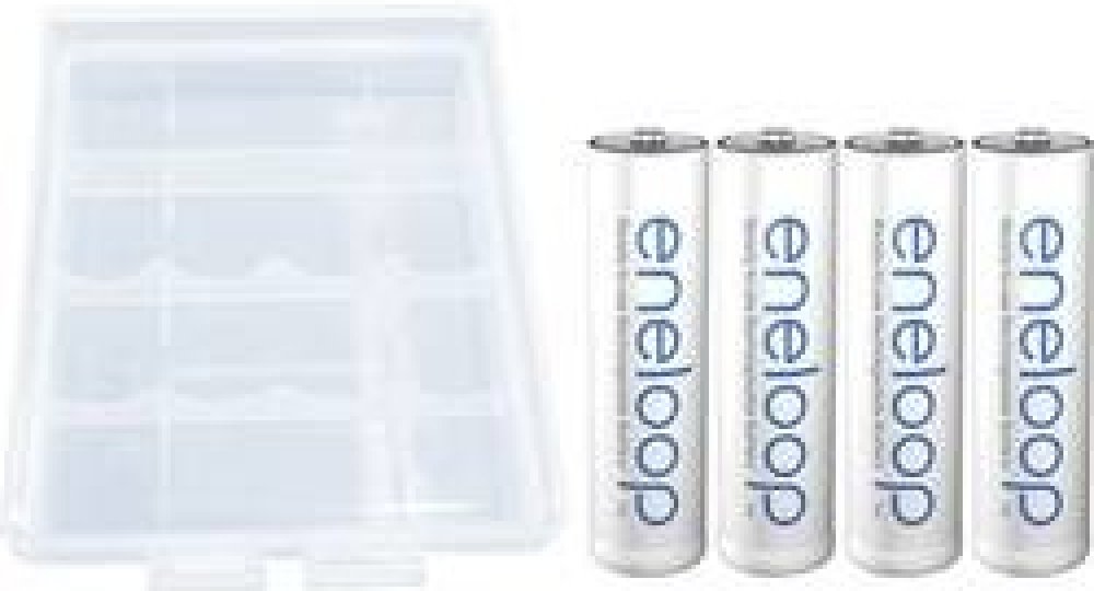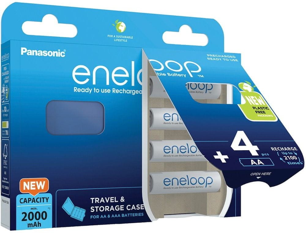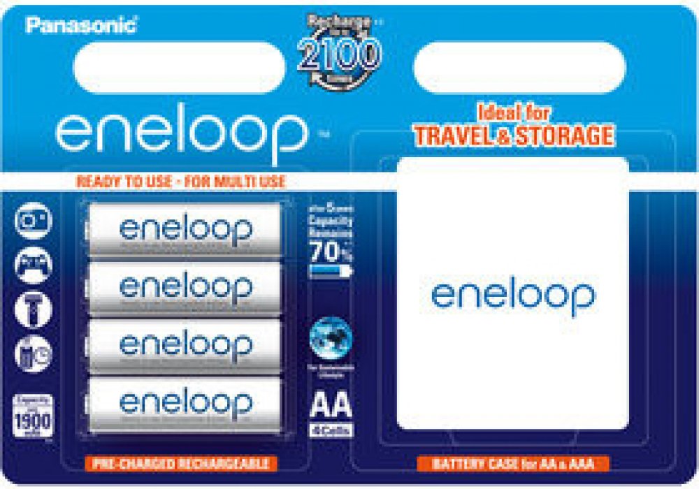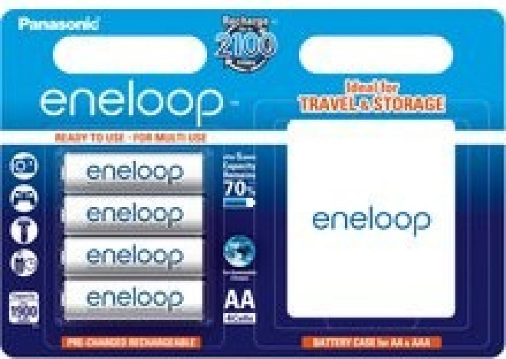 Toto balení Eneloop obsahuje 4 baterie AA a praktické pouzdro pro snadné skladování.