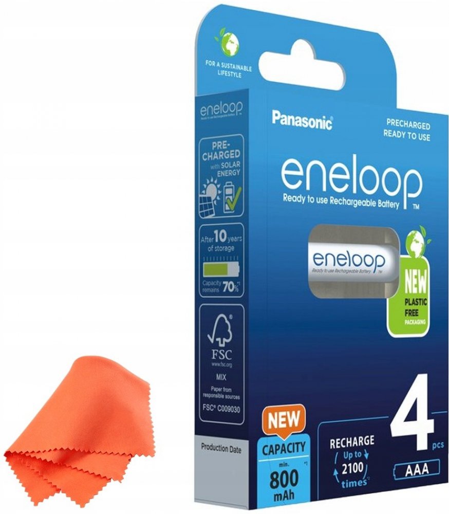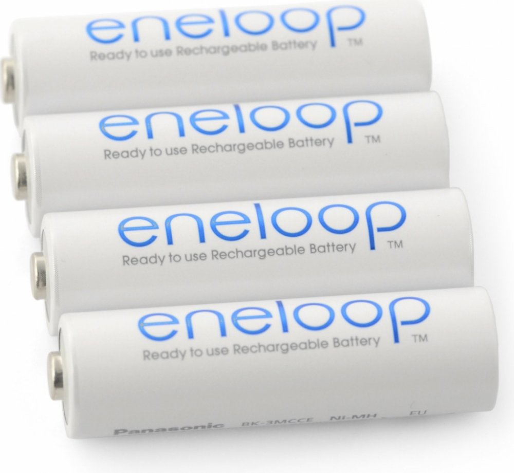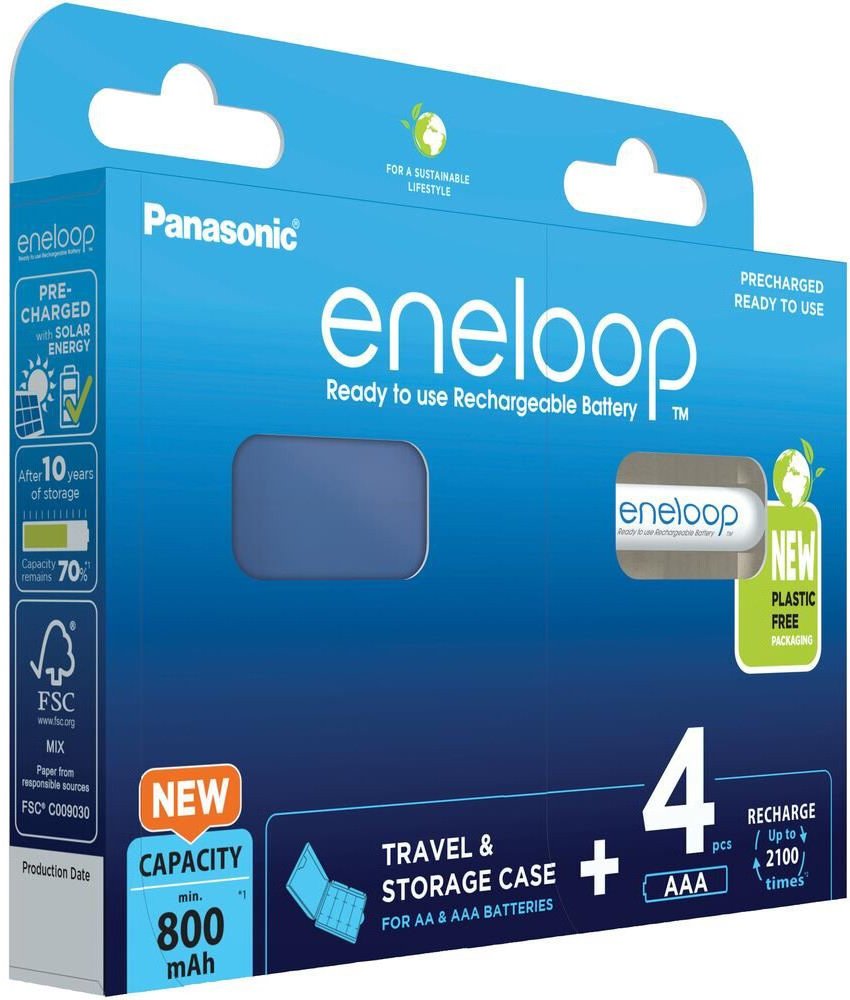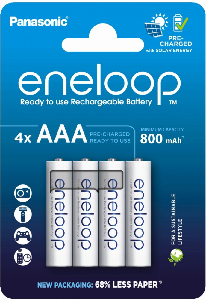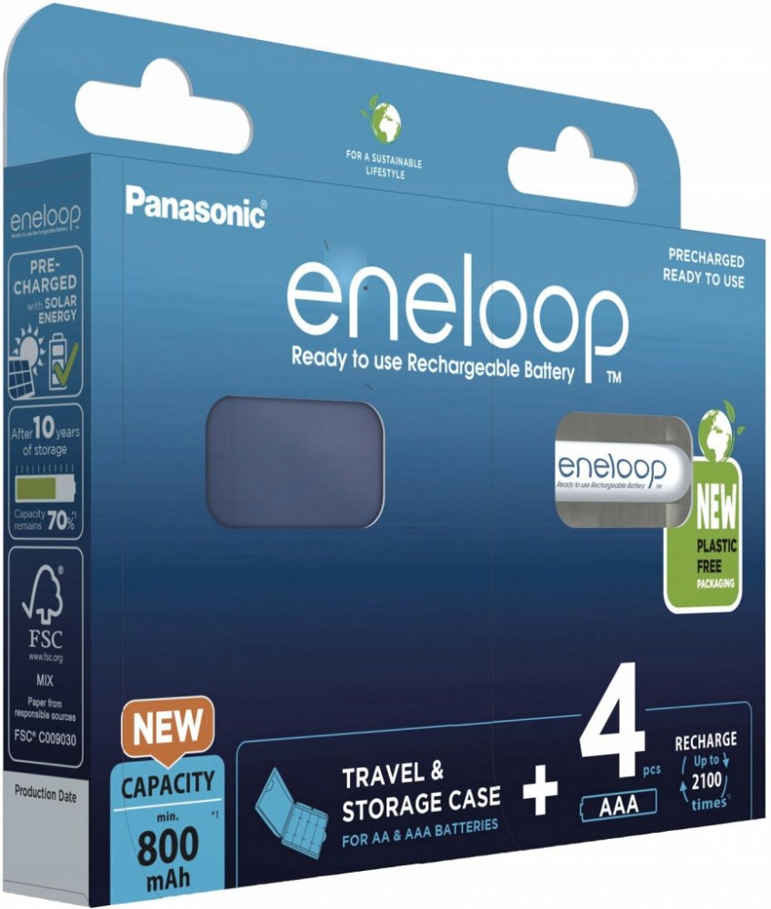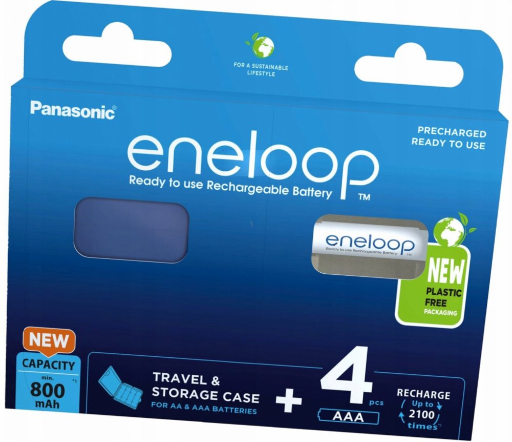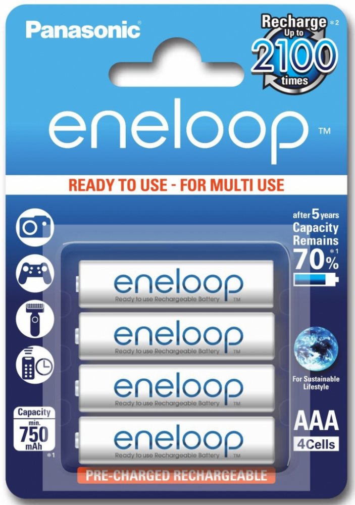 NiMH akumulátory PANASONIC - ENELOOP. Unikátní mikrotužkové baterie AAA (R03) nově s 2100 dobíjecími cykly, které mají maximálně eliminovaný efekt samovybíjení. Díky speciální technologii udrží tyto baterie po dobu deseti let 70% své kapacity. Baterie Eneloop se dodávají v nabitém stavu a jsou připraveny k okamžitému použití, což rozšiřuje možnosti jejich použití pro mnoho aplikací. Vhodné jsou zejména pro napájení fotoaparátů, bezšňůrových telefonů, walkmanů, diskmanů a všech zařízení, kde jsou používány alkalické primární baterie.
